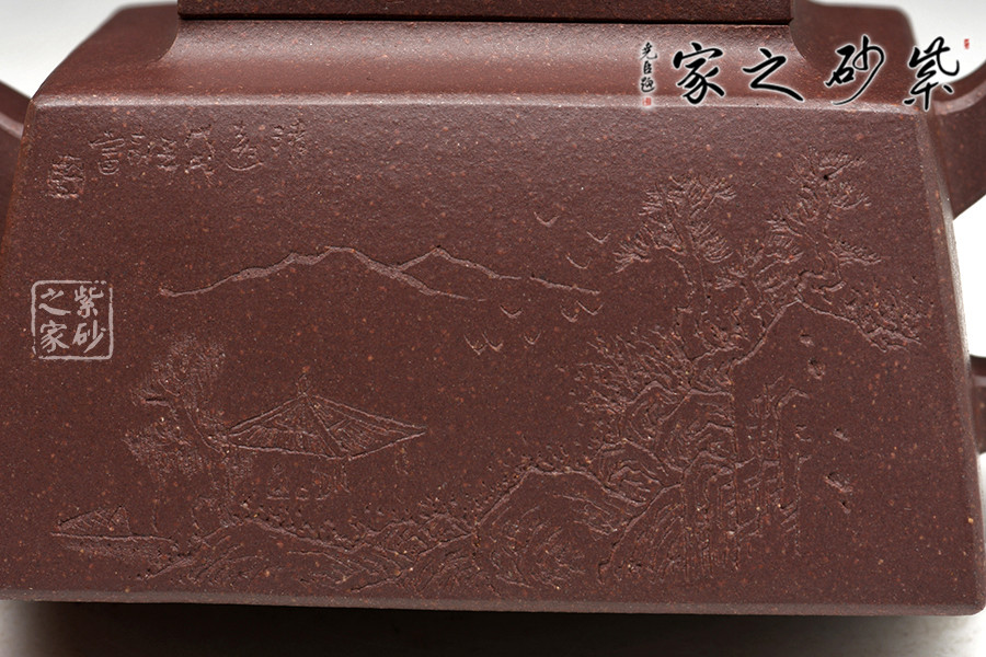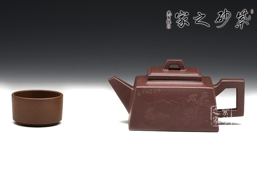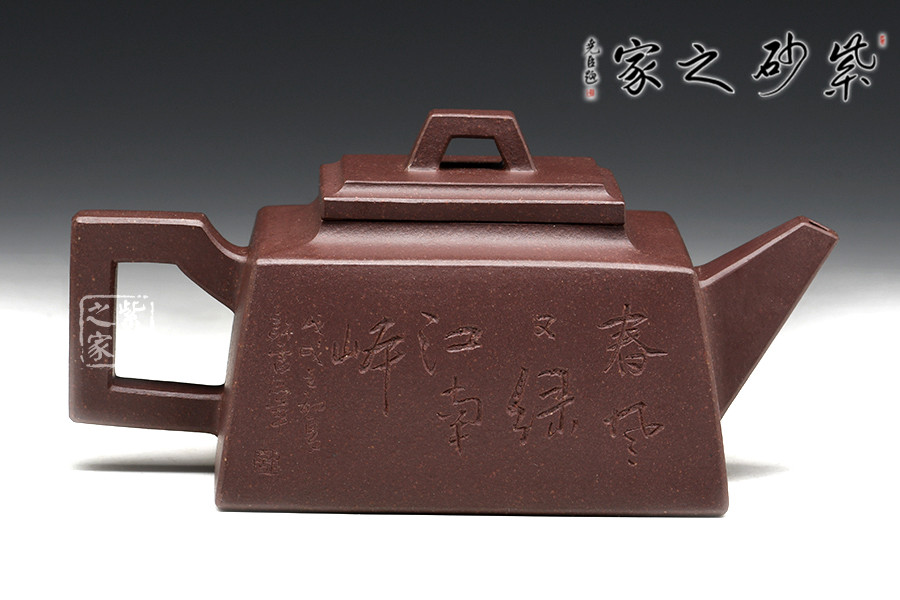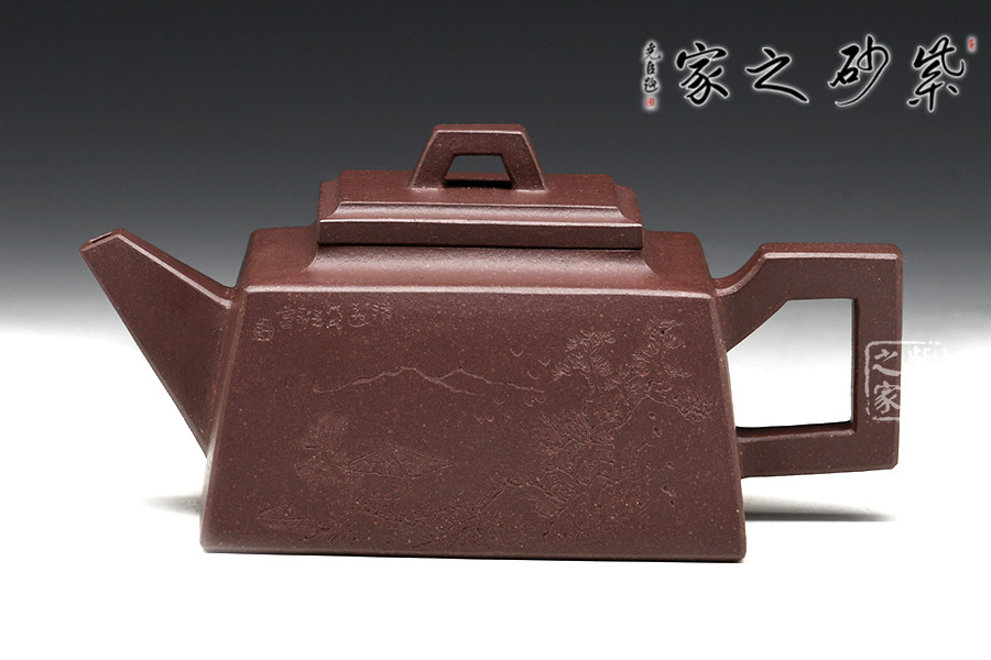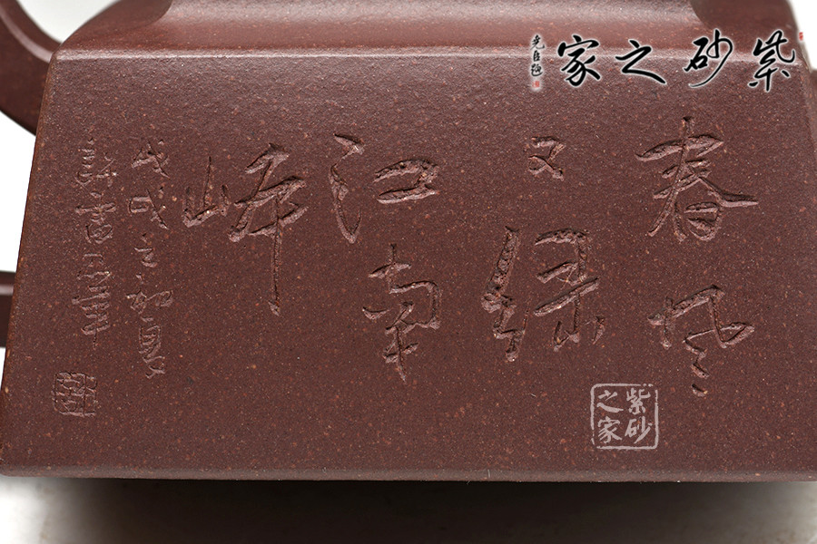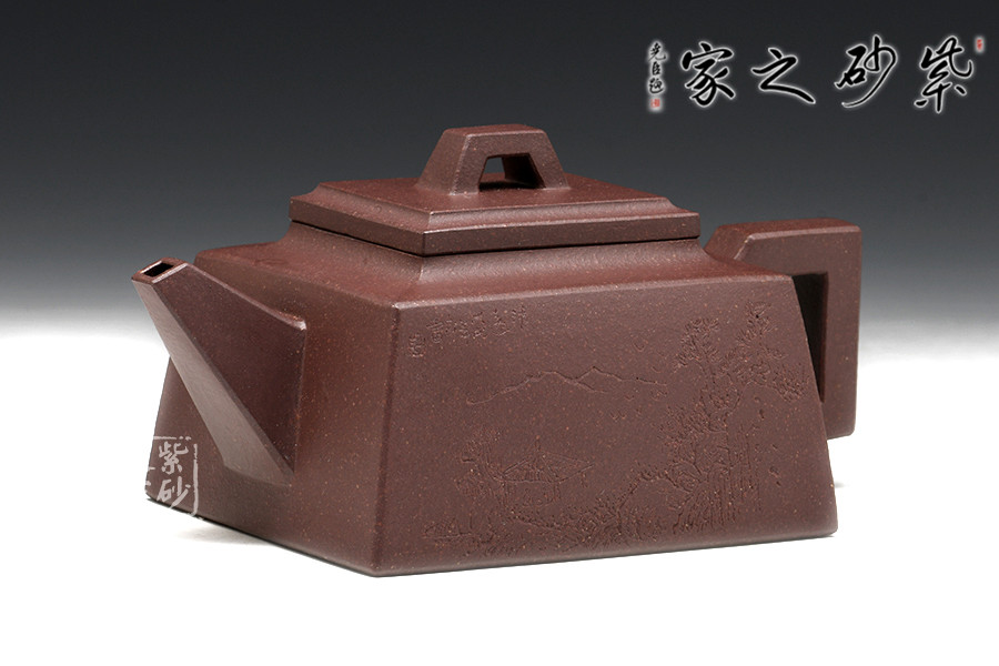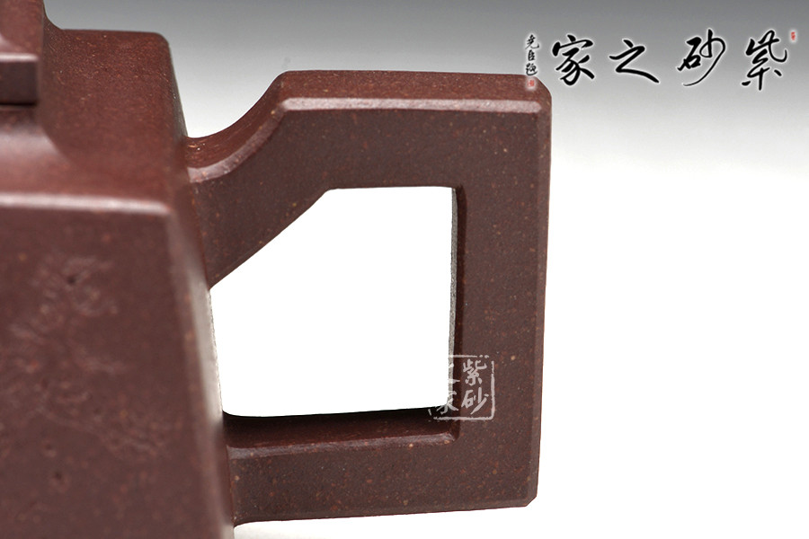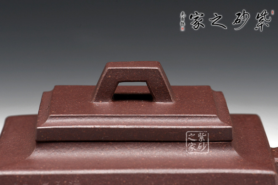 此壺采用原礦紫泥制成,細膩柔和,色澤厚重,底蘊深沉??此拼植趽崦s又極其細膩,以手撫之,細膩、柔潤之中略有砂感。此壺四方基底,下寬上窄,使此壺具備方壺穩(wěn)重剛強的優(yōu)點,又不流于呆板單調。俯視,平整的小方蓋與大平底的輪廓線梯形變化,其蓋鈕正處于壺蓋中心的位置上,更顯示出其制作技藝的高超。壓蓋,橋型方鈕。敦厚實在。直嘴方把,出水流利,斷水自然,握在手里,剛勁有力,氣勢雄偉??傮w造型簡練渾樸,寓剛挺于巧麗之中,具有時代器皿造型簡樸大度的氣勢,堪稱早期紫砂壺造型高雅佳作。
