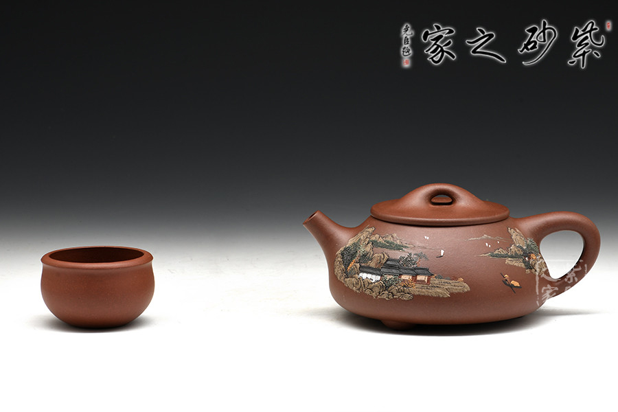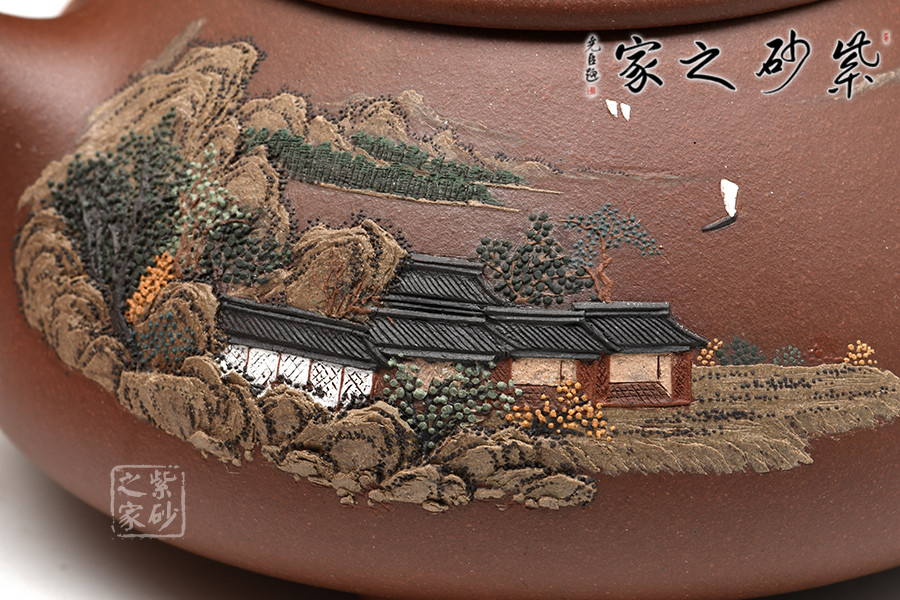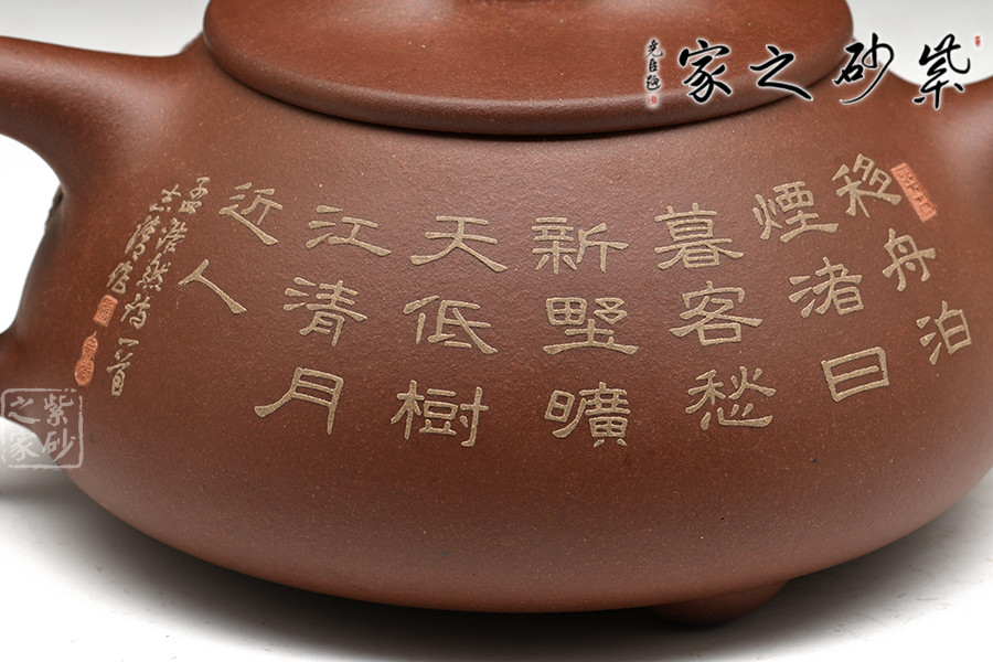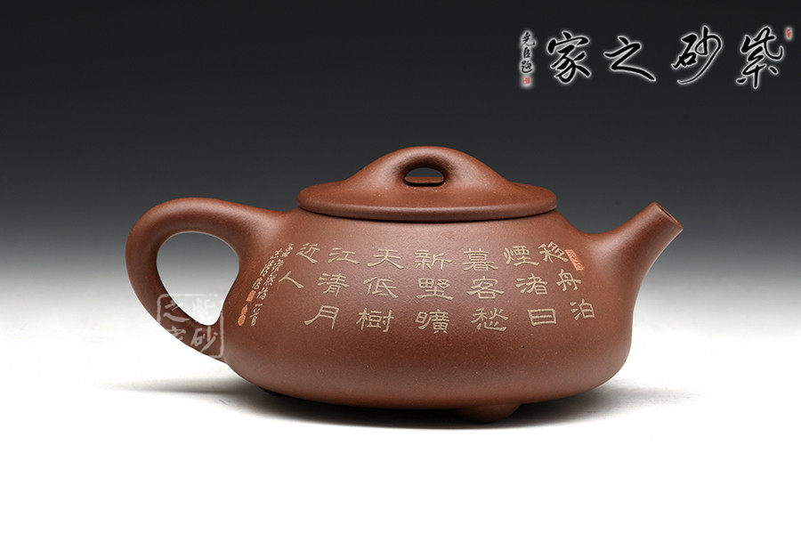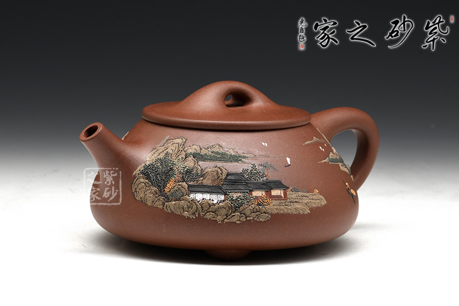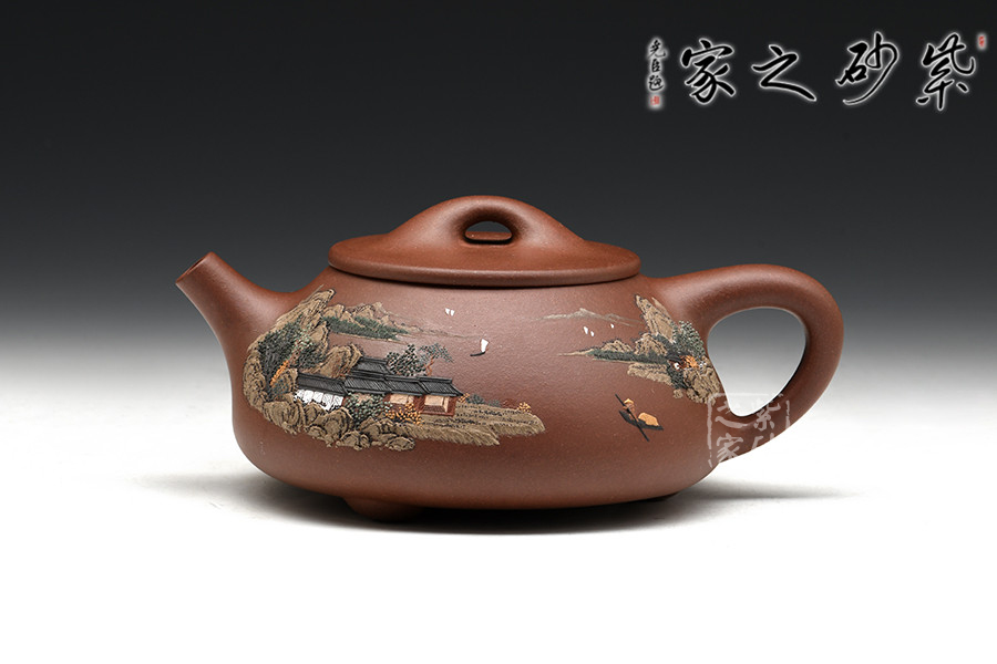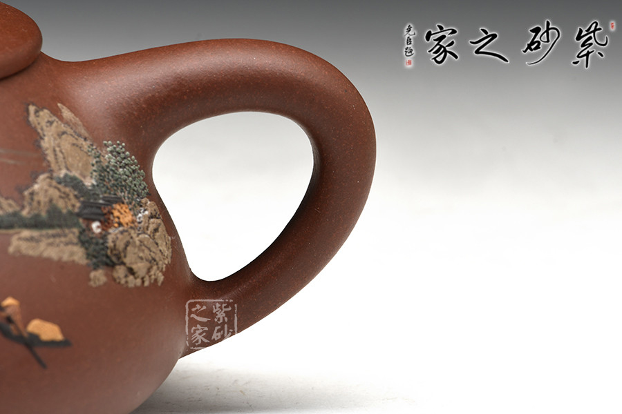 此壺為經(jīng)典傳統(tǒng)壺式石瓢,以富有三角意味的壺體、直流、三角形壺把,三枚圍棋字形狀的壺足,構(gòu)成了多個(gè)三角韻味的幾何造型。壺形優(yōu)美,氣韻大雅,剛?cè)嵯酀?jì),壺穩(wěn)重而不失輕盈,壺身較為寬大,宜書宜畫,老師親自在壺身泥繪山水畫意圖,并輔以詩句,提升了石瓢壺的人文氣韻。