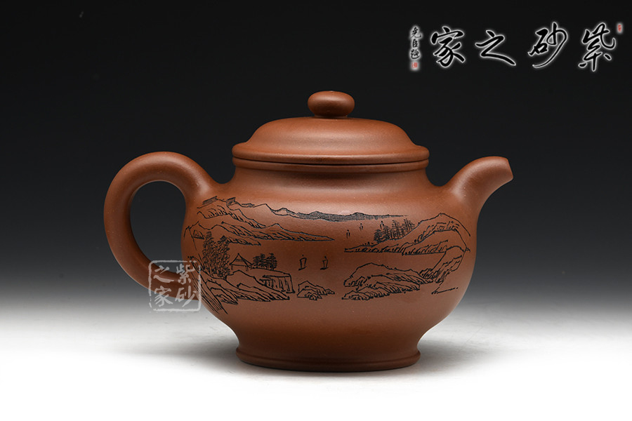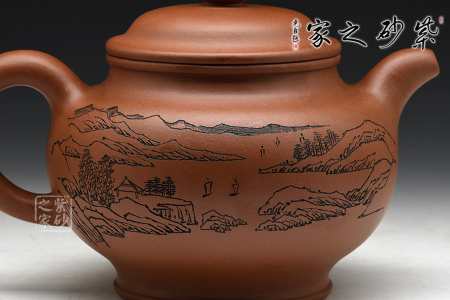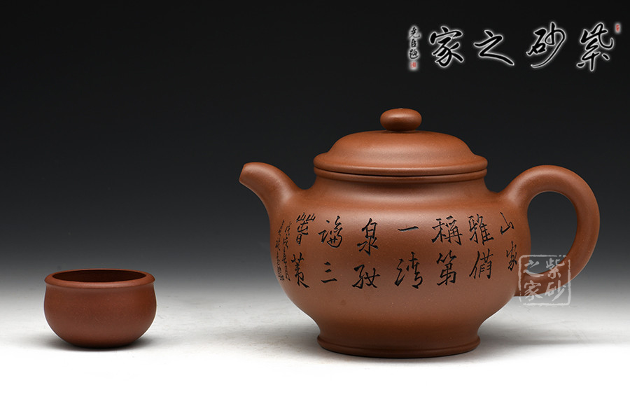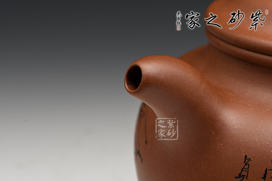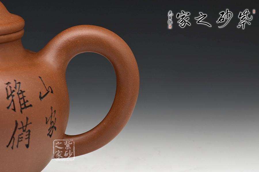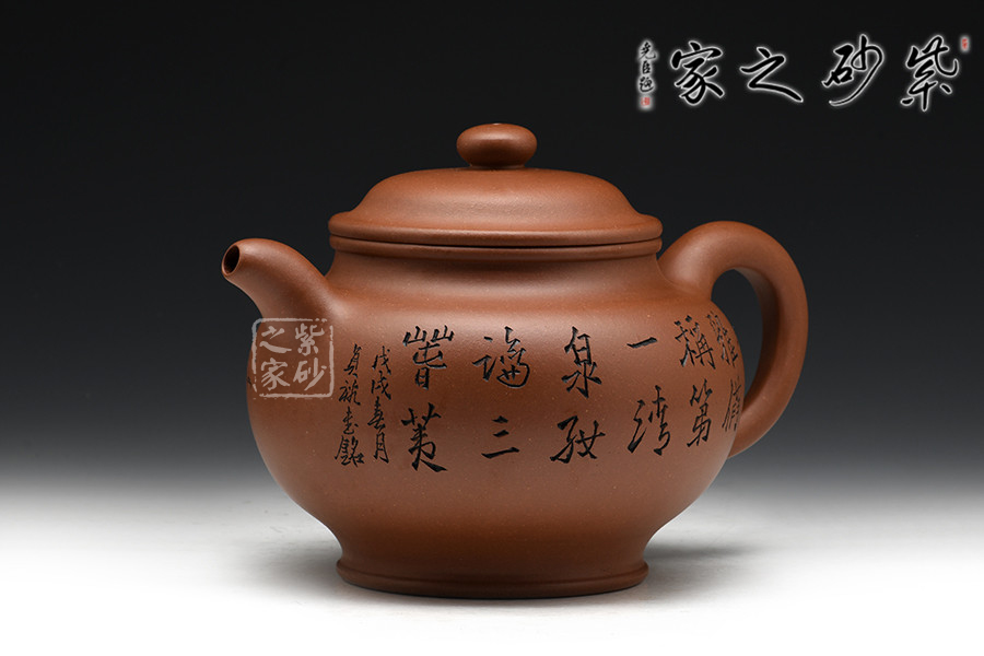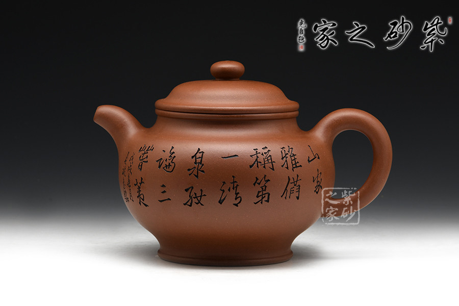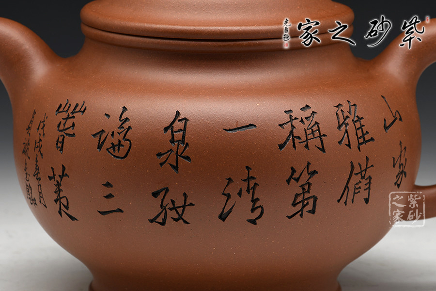 中國工藝美術(shù)大師李昌鴻入室弟子楊瑤芬,雕塑、刻繪及制壺均精通,是位技藝全面的實力派藝師。仿傳統(tǒng)佳器,造型如許多球狀和半球狀堆積到一起,是典型的幾何型傳統(tǒng)圓壺式。飽滿的壺身,斗笠似的壺蓋,珠鈕線條流暢,點線之間頗見功力,整器雄健渾厚、圓潤大度。作品骨肉亭勻,光澤沉綿,線條至簡卻氣度非凡,以簡練形體來展示其美的內(nèi)蘊,古意新韻,氣魄端莊。譚泉海大師高徒、研究員級高工吳貞??汤L詩畫裝飾,增添文人雅趣,賞之怡然。