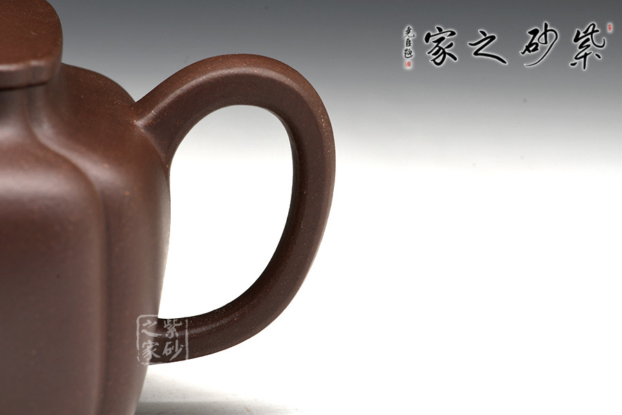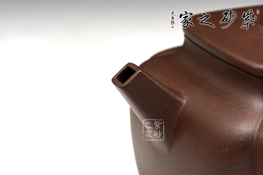 方型、方流挺翹而出,出、斷水干凈利落;橋型鈕流暢自然,與壺蓋渾然一體;彎把線條硬朗,與壺嘴左右呼應(yīng),氣度非凡。