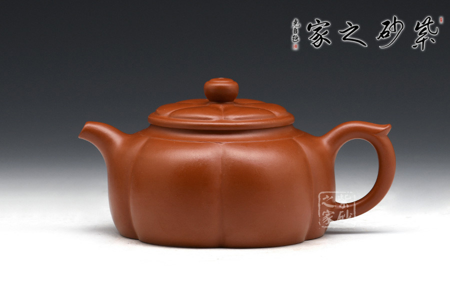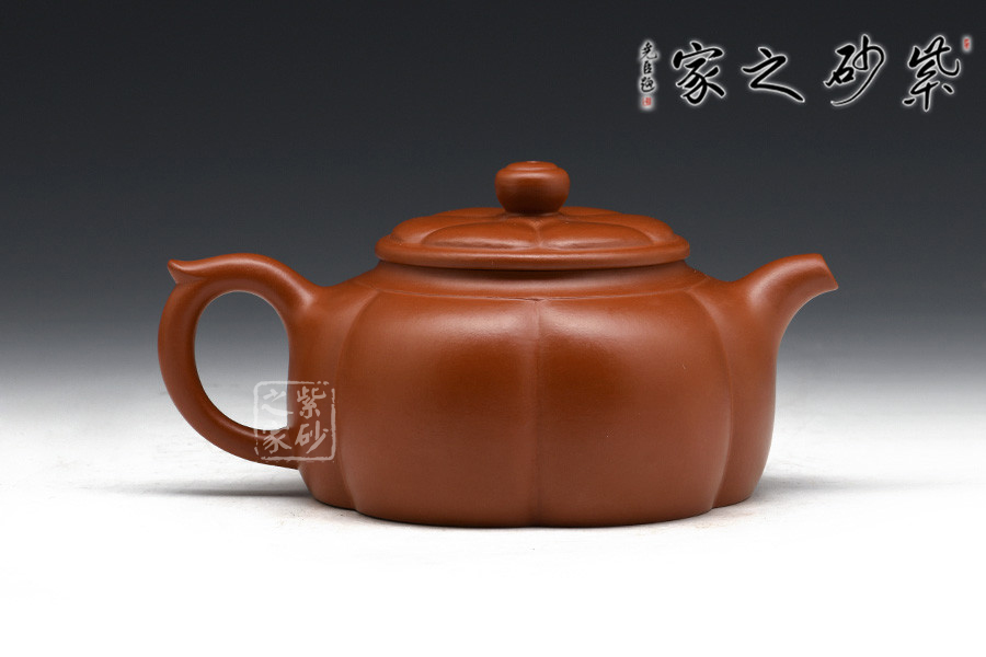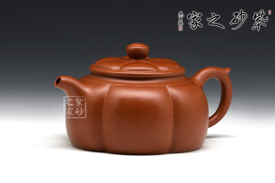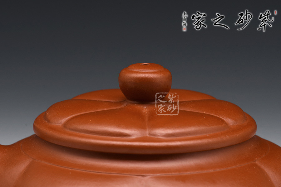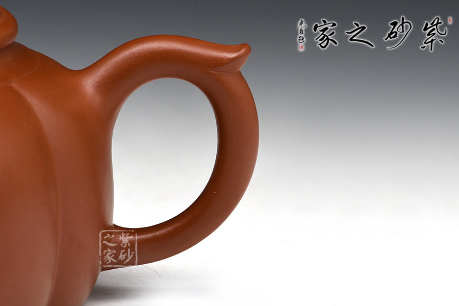 此器即以菊花發(fā)展變化而來,壺身筋囊飽滿,紋路清晰,線條明快,手法干凈利落,自壺鈕至壺底皆以筋紋一以貫之,口蓋吻合嚴密,壺嘴與耳形把前后相應(yīng)。采用原礦朱泥,色澤紅潤,更顯出壺身的婉約之美。