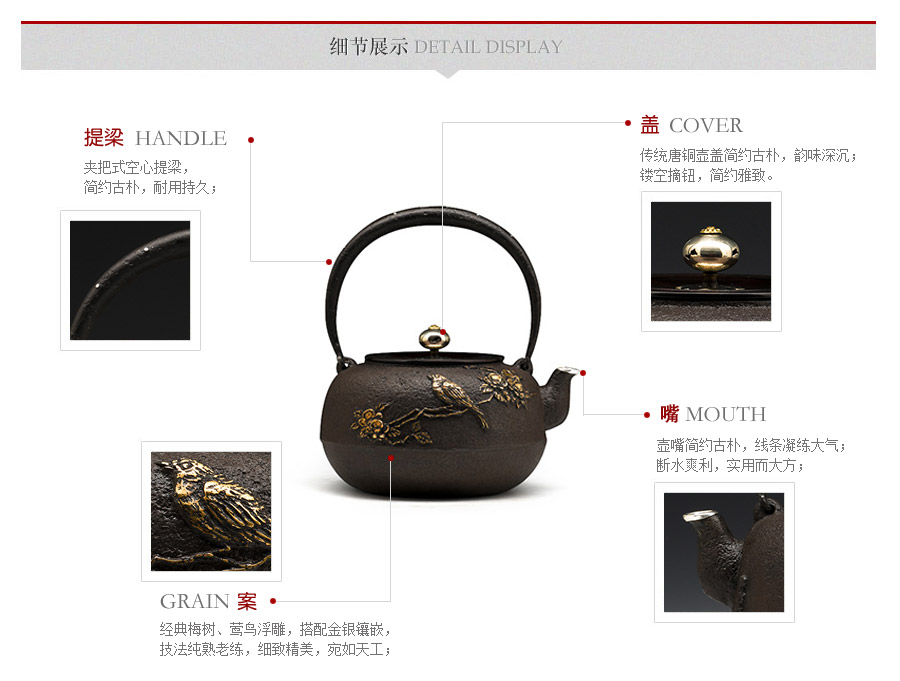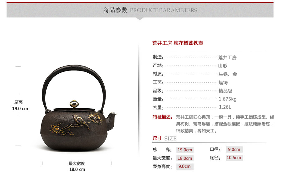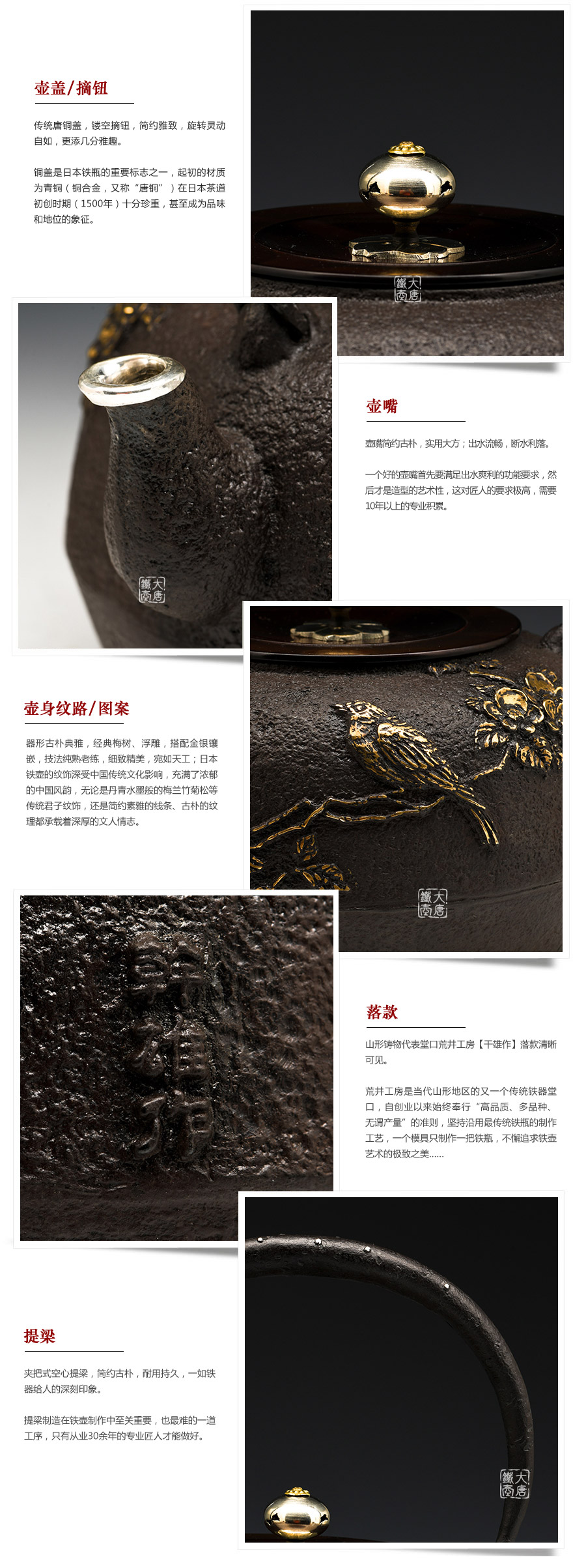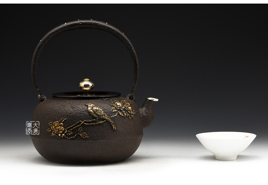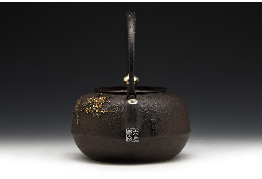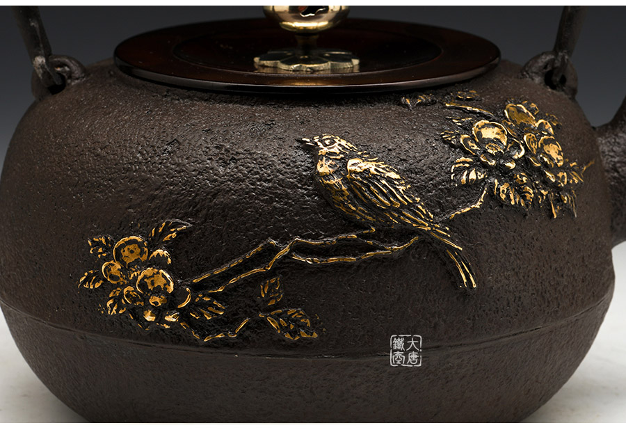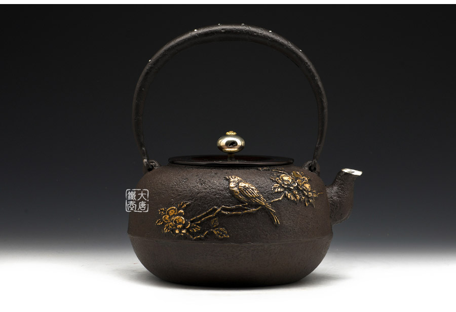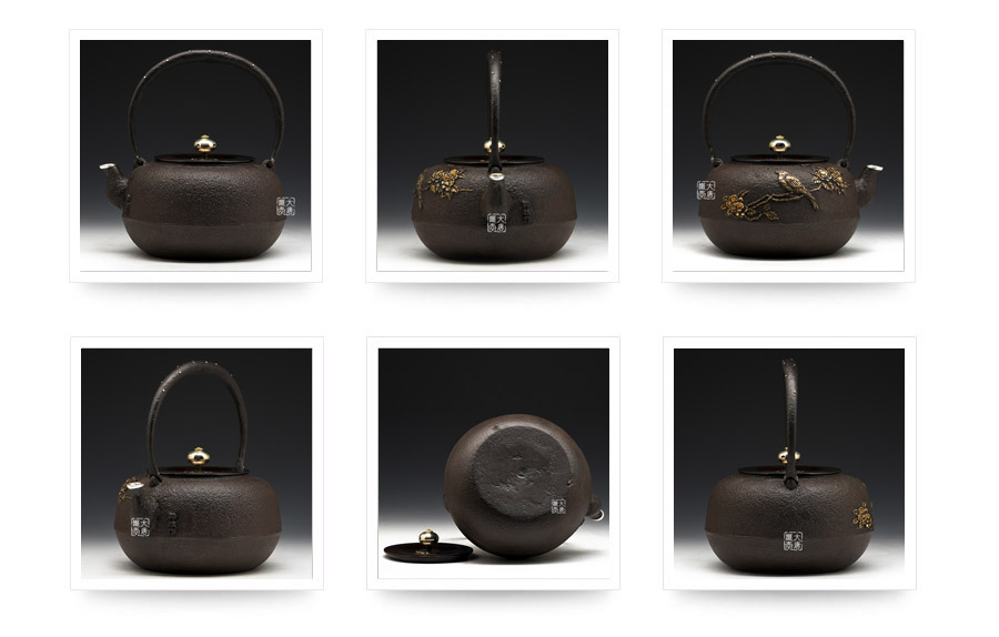 荒井工房匠心典范,一模一具,純手工蠟鑄成型。經(jīng)典梅樹、鶯鳥浮雕,搭配金銀鑲嵌,技法純熟老練,細致精美,宛如天工。