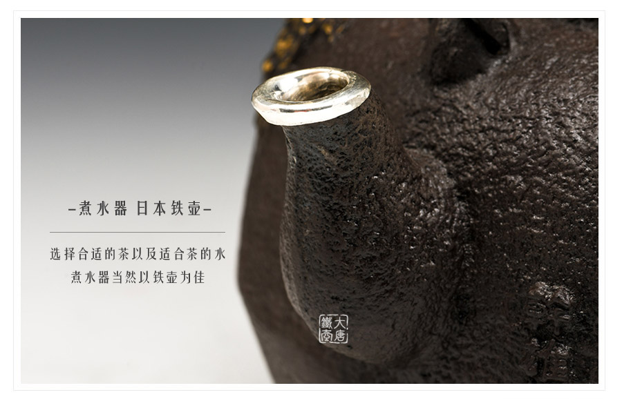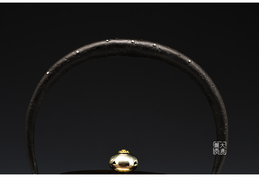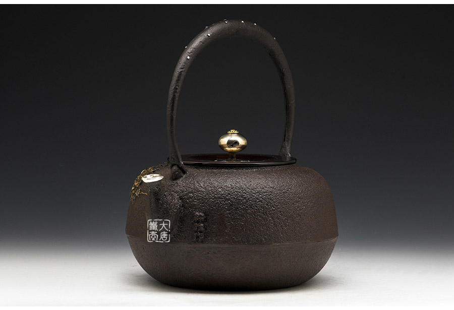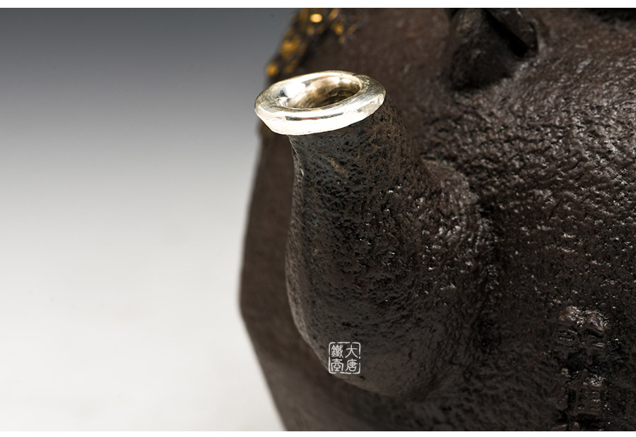 荒井工房的鐵瓶除了在鑄造工藝上有嚴格的規(guī)范和體系,在鐵瓶裝飾技術上也頗有建樹。除了傳統(tǒng)的印刻技術外,荒井工房還掌握了非常出色的金銀鑲嵌技藝,尤其以大片的鏨刻銀片最為出眾,這在山形當?shù)靥每谥歇殬湟粠谩?/p>