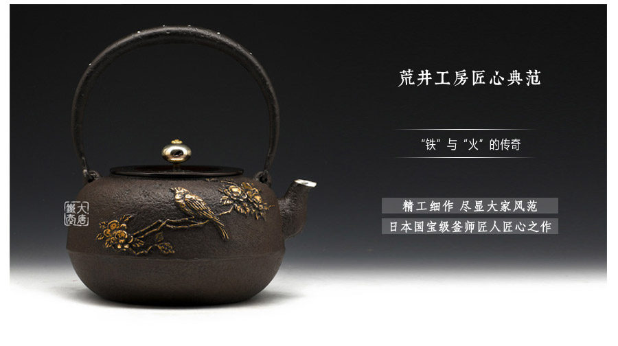 為了追求更為精致的紋理和細節(jié),當代堂主荒井干雄孜孜不倦的將全部精力投入鐵瓶的創(chuàng)作之中,每一作品都經(jīng)由精心醞釀,純手工精心制作,不僅將荒井一家的祖?zhèn)骷妓嚢l(fā)揚光大,同時也在鐵瓶界闖出了自己的名聲,成為當代的釜師名家。