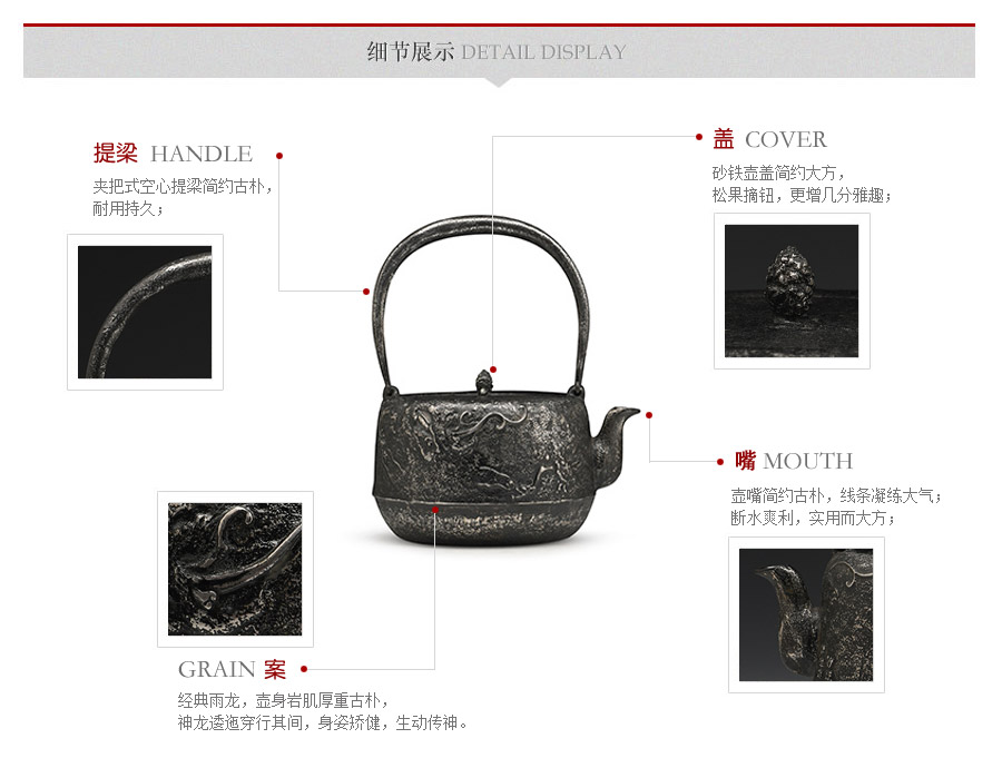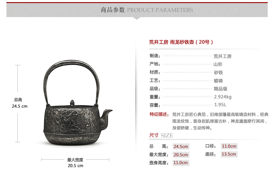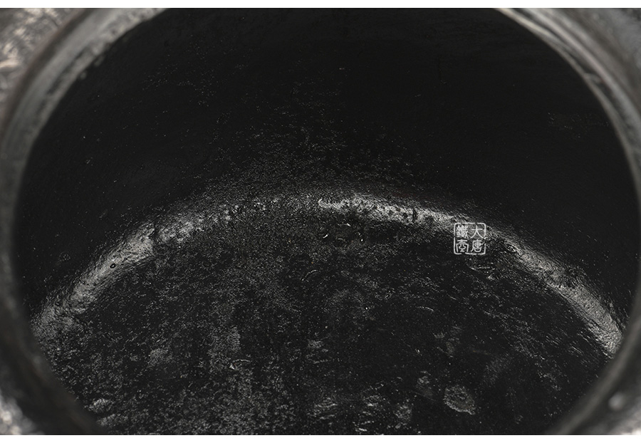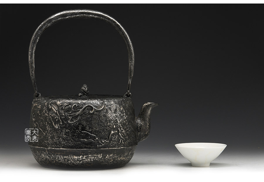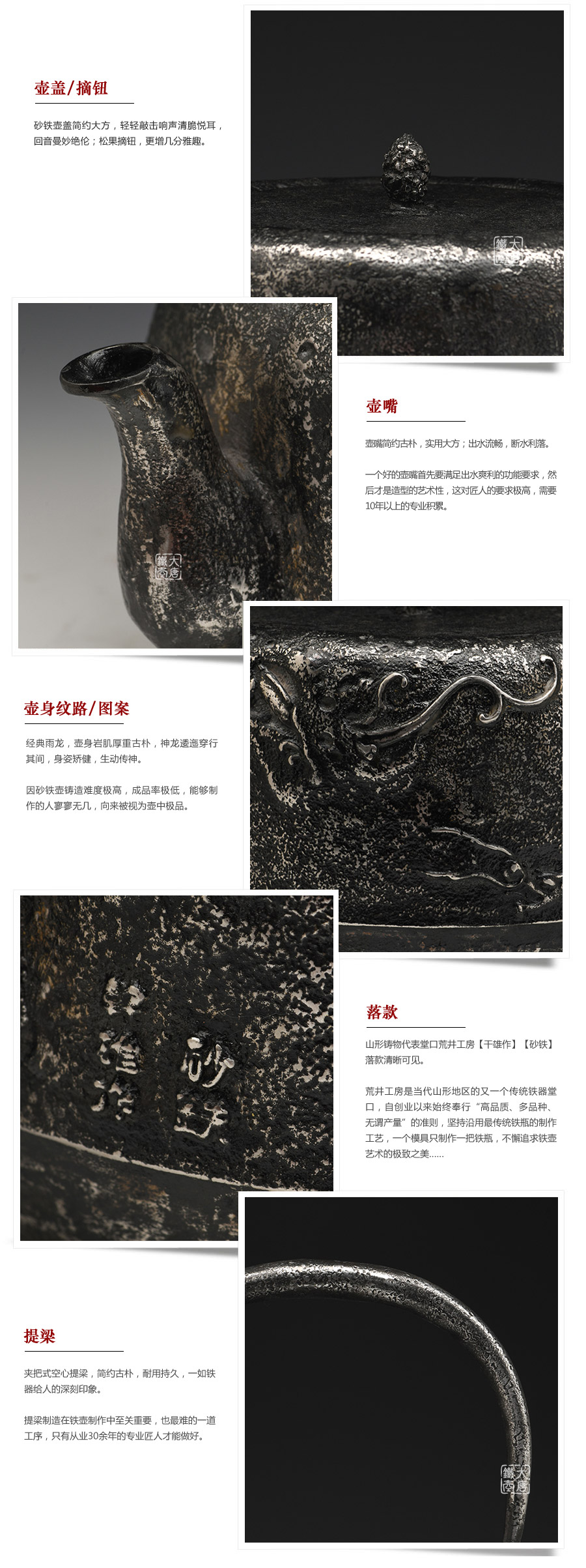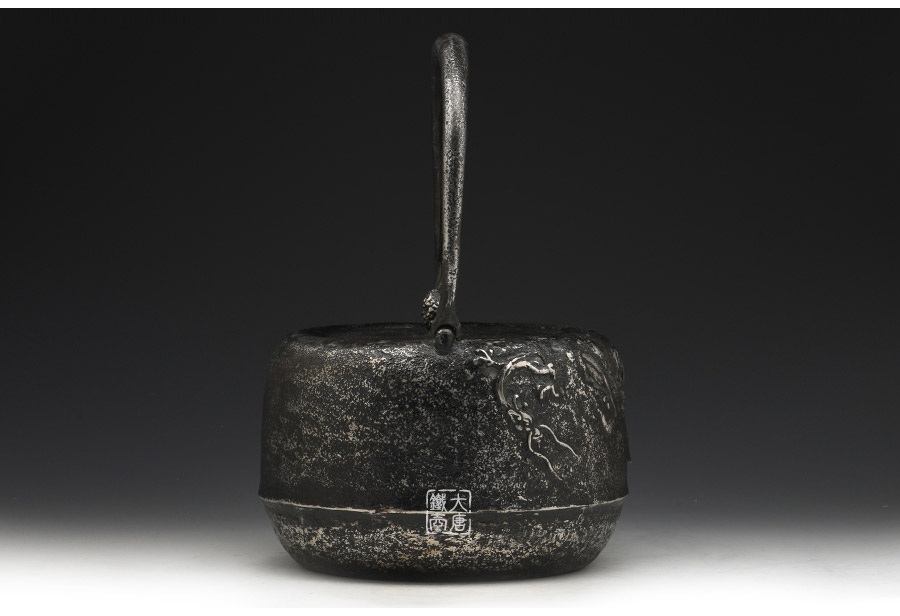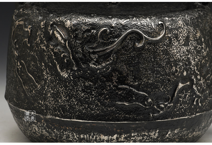 荒井工房匠心典范,舊南部藩最高級鑄造材料,經(jīng)典雨龍紋飾,壺身巖肌厚重古樸,神龍逶迤穿行其間,身姿矯健,生動傳神。