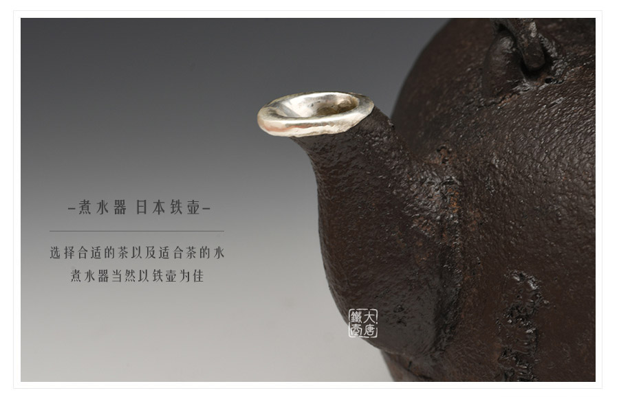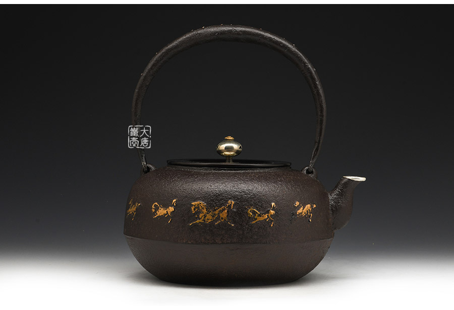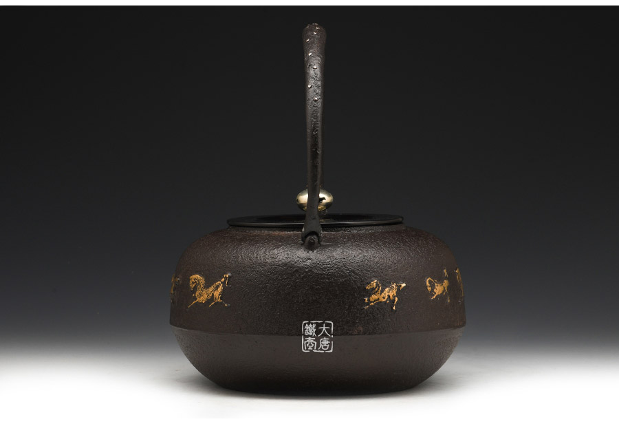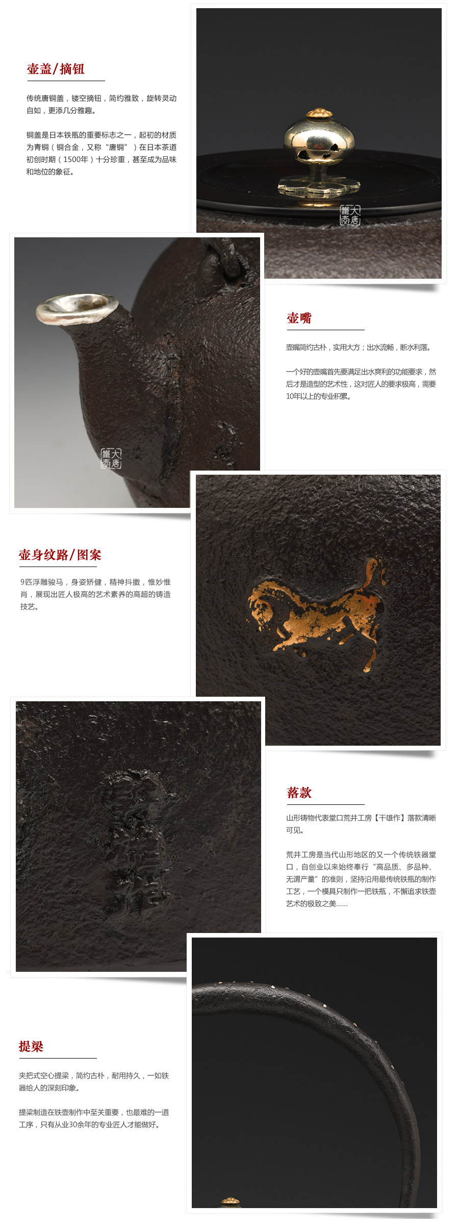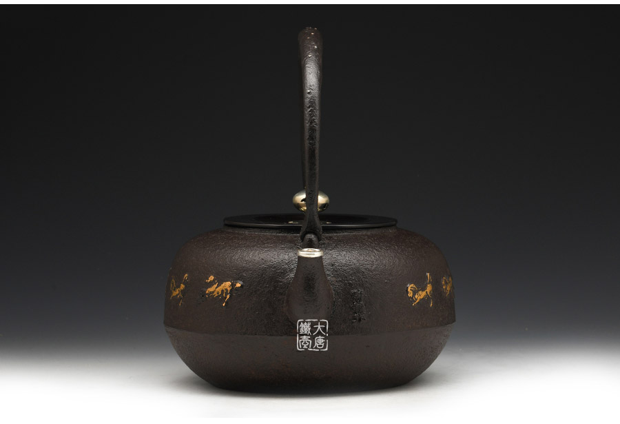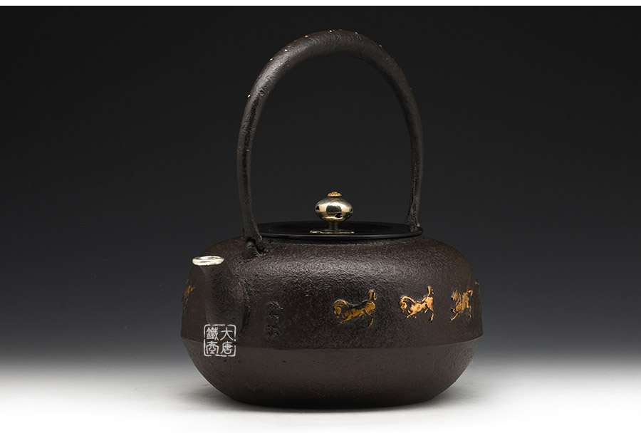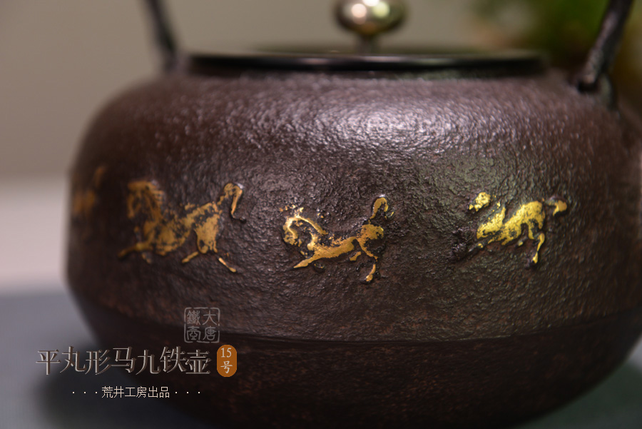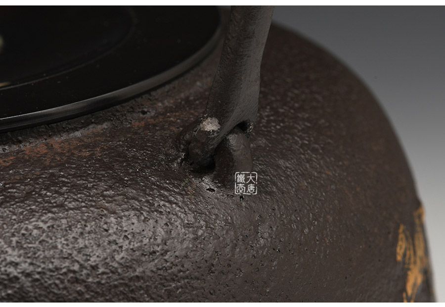 荒井工房的鐵瓶除了在鑄造工藝上有嚴(yán)格的規(guī)范和體系,在鐵瓶裝飾技術(shù)上也頗有建樹。除了傳統(tǒng)的印刻技術(shù)外,荒井工房還掌握了非常出色的金銀鑲嵌技藝,尤其以大片的鏨刻銀片最為出眾,這在山形當(dāng)?shù)靥每谥歇?dú)樹一幟。