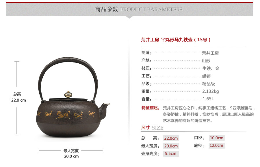 荒井工房是當(dāng)代山形地區(qū)的又一個(gè)傳統(tǒng)鐵器堂口,自創(chuàng)業(yè)以來始終奉行“高品質(zhì)、多品種、無謂產(chǎn)量”的準(zhǔn)則,堅(jiān)持沿用最傳統(tǒng)鐵瓶的制作工藝,一個(gè)模具只制作一把鐵瓶,不懈追求鐵壺藝術(shù)的極致之美……