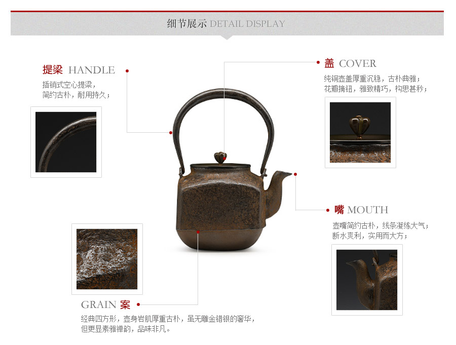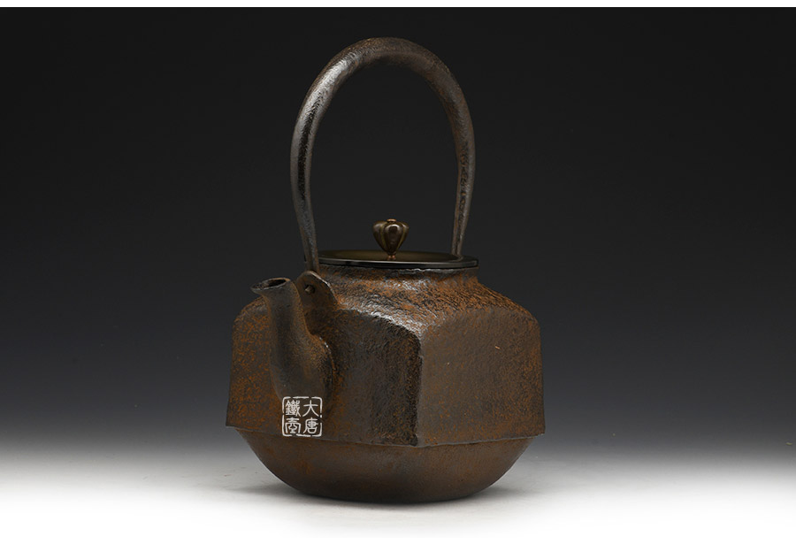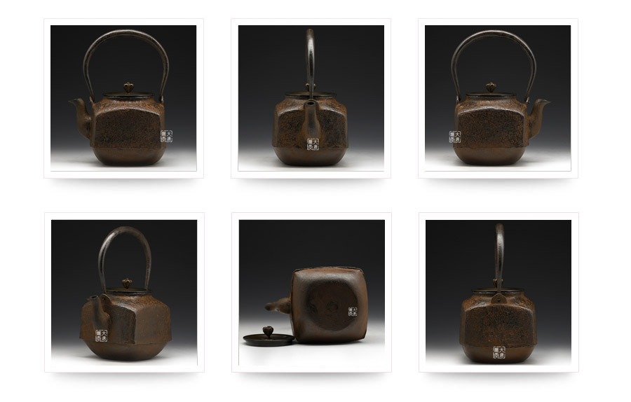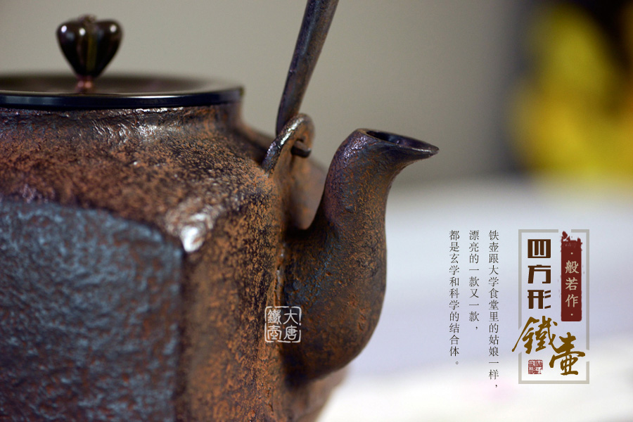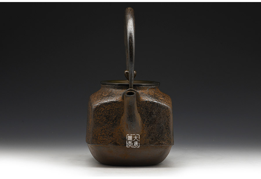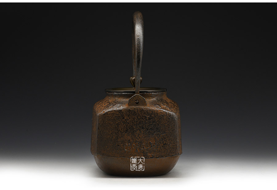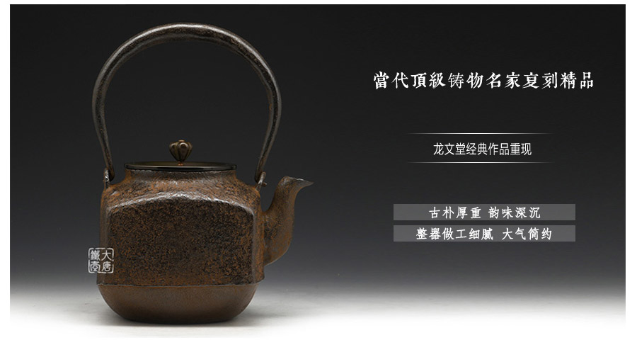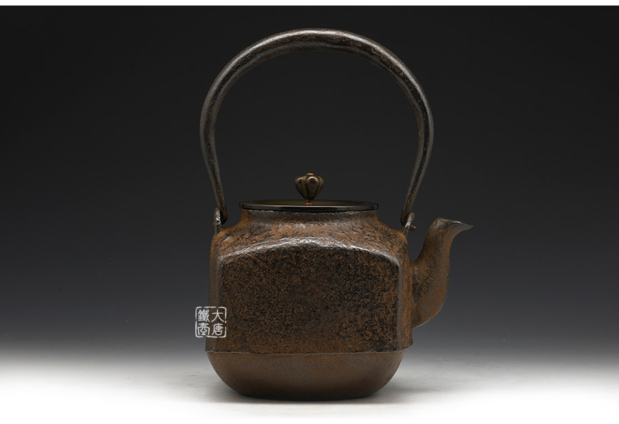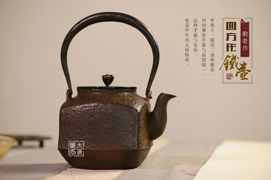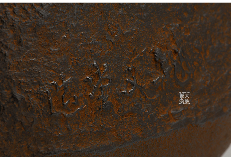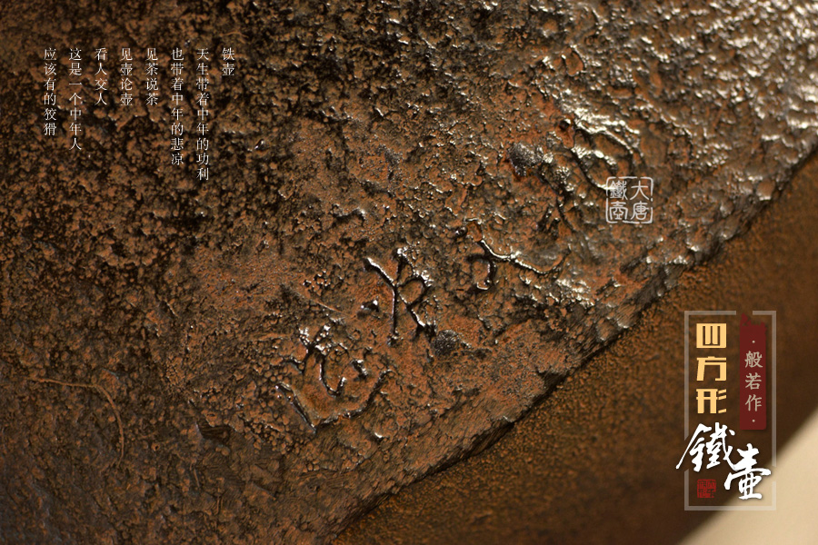 當(dāng)代鑄物名家般若勘溪巔峰精品,龍文堂經(jīng)典作品重現(xiàn),經(jīng)典四方型,作者對(duì)瓶身肌理紋的處理細(xì)膩非常,在砂模制作時(shí)人為做出少許斑駁,來表現(xiàn)一種自然形成的風(fēng)化巖石肌理,配合使用者的茶道修行。