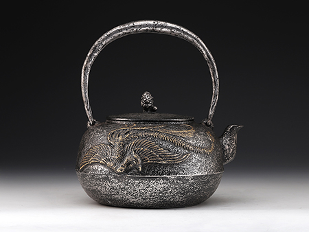 虎山工房創(chuàng)立于1955年,位于盛岡市手作村,是日本南部鐵器中的重要代表?!被⑸健敝从诔醮獛熜芄绕郊某錾厥且郧澳喜糠曫B(yǎng)老虎的地方,故取“虎山”作為工房的名字。熊谷平吉擅長(zhǎng)印刻湯釜和鐵瓶上的圖案,制作的鐵器帶有濃厚的藝術(shù)氣息,被視為鐵和火融合于一身的茶道藝術(shù)品?;⑸焦し恐谱鞯蔫F瓶,主要以砂模澆鑄的方法為主,但是改進(jìn)了木質(zhì)刮板的制模技術(shù),從而得以制作出多邊形的鐵器,在南部鐵器中獨(dú)樹(shù)一幟。