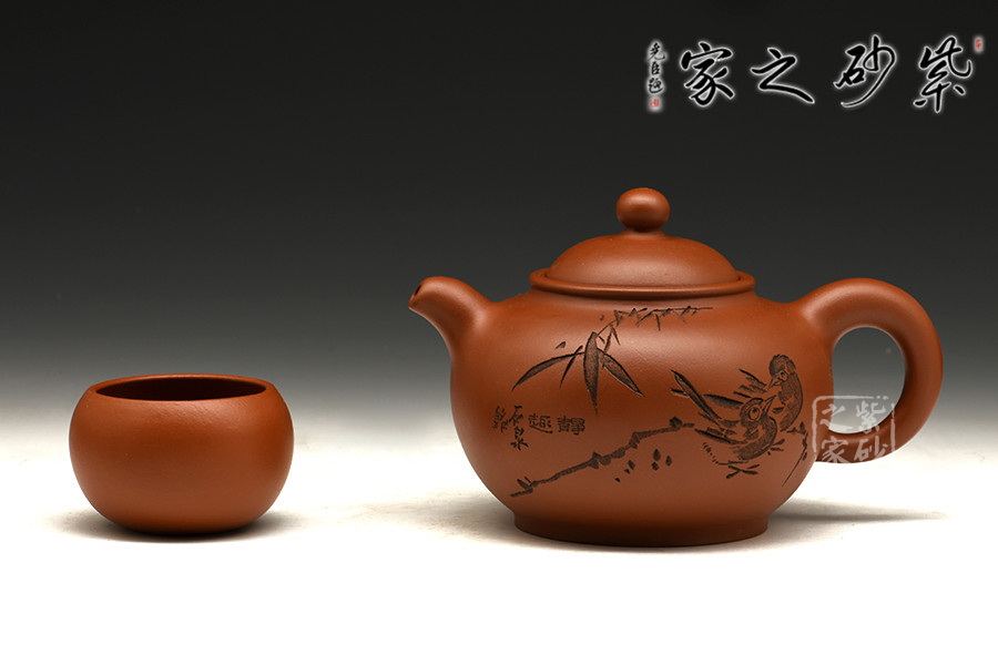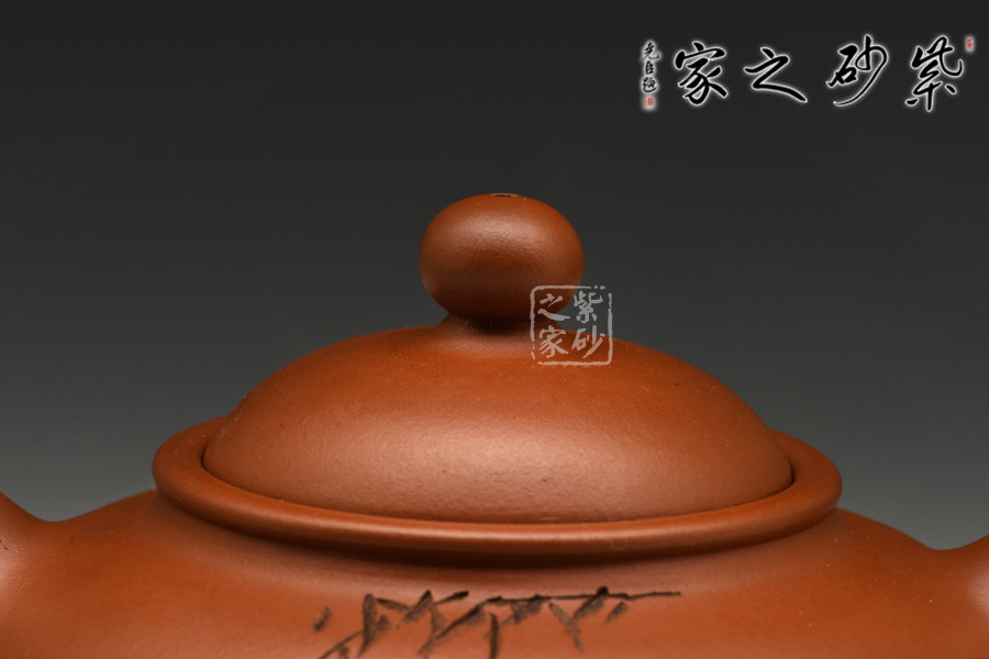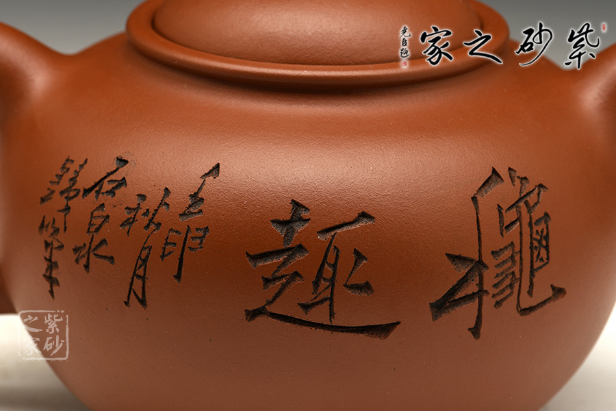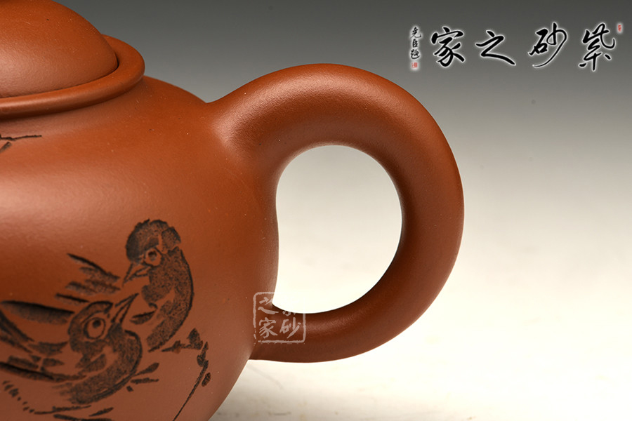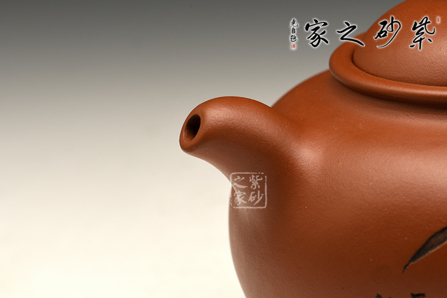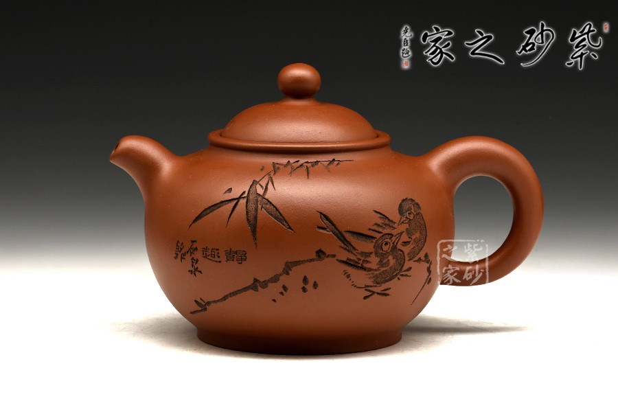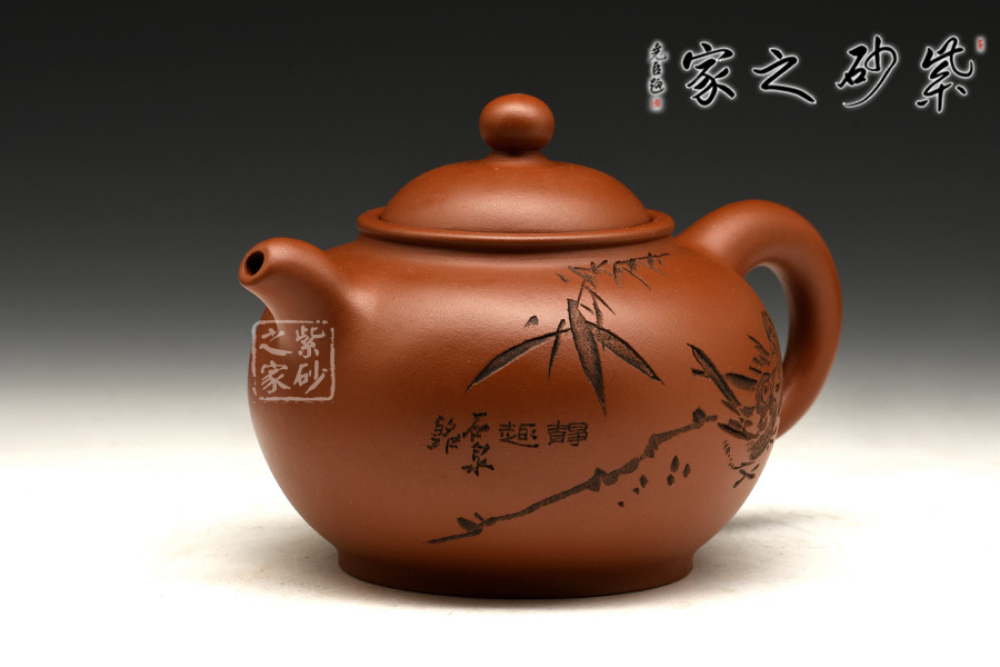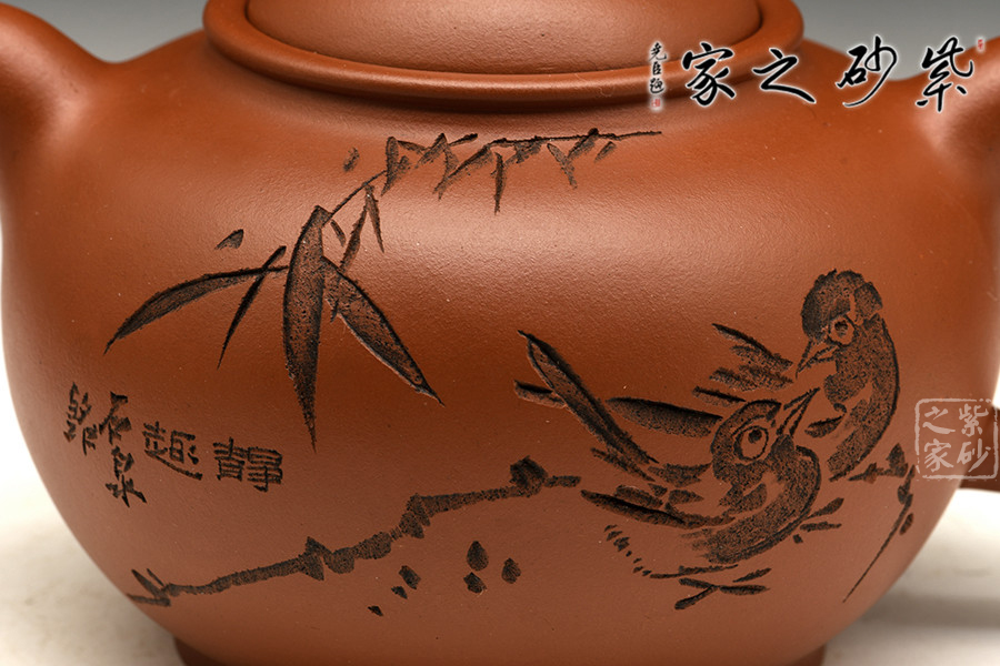 渾圓的壺身,渾圓的壺鈕,渾圓的線(xiàn)條流暢至極,此壺比例得當(dāng),骨肉亭勻;暗接彎流,柔美之姿明顯,端口下沉,利于出水;壓蓋設(shè)計(jì),似含溫情,氣密性好;珠鈕精巧,玲瓏可愛(ài),拿捏適手;彎把跳起后落下,姿態(tài)優(yōu)美,把執(zhí)適手。壺身正面由譚泉海大師刻竹林鳥(niǎo)趣,反面刻靜趣,刻繪與鳥(niǎo)趣呼應(yīng),渾然一體,是藏家不可多得的佳品。