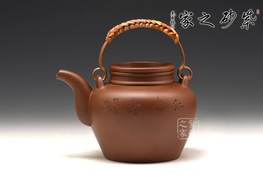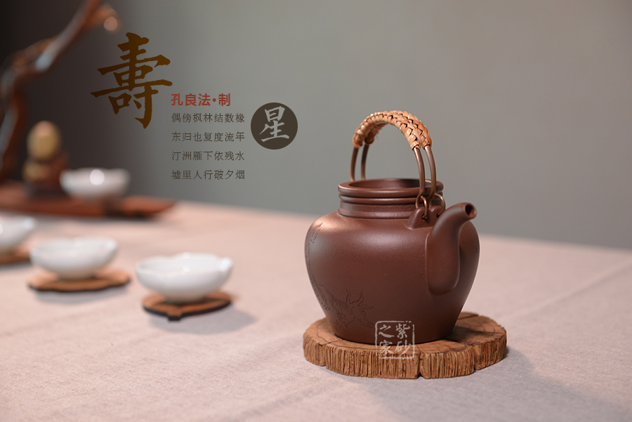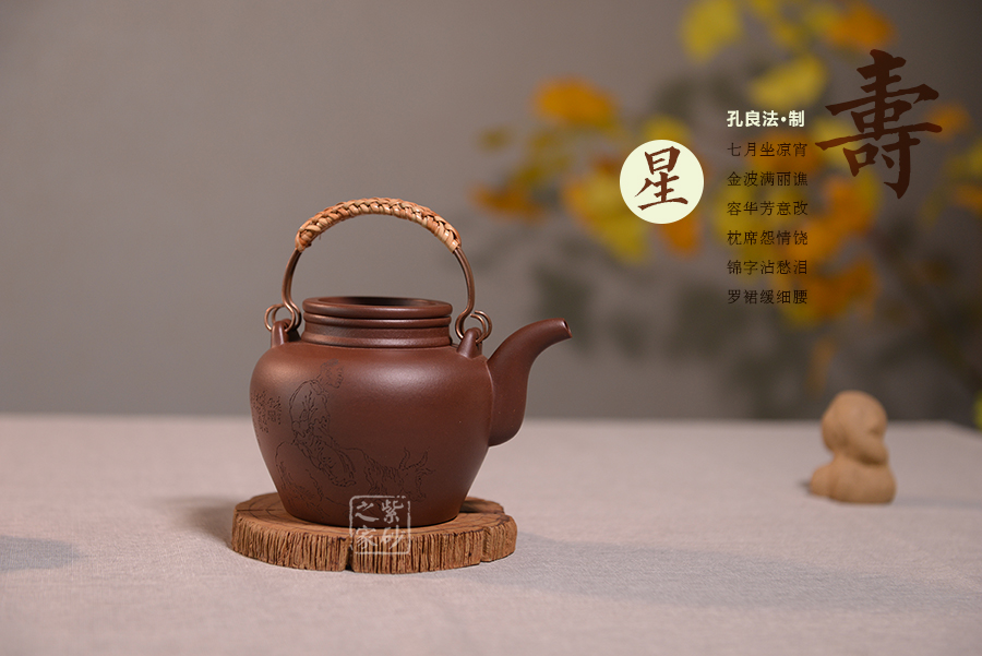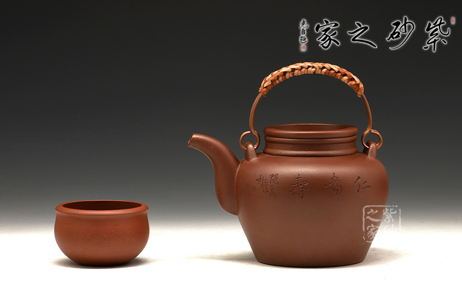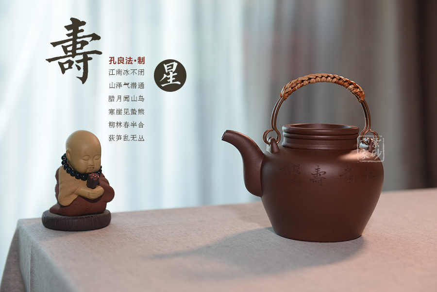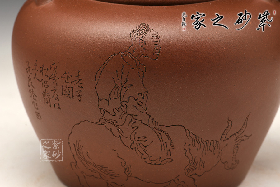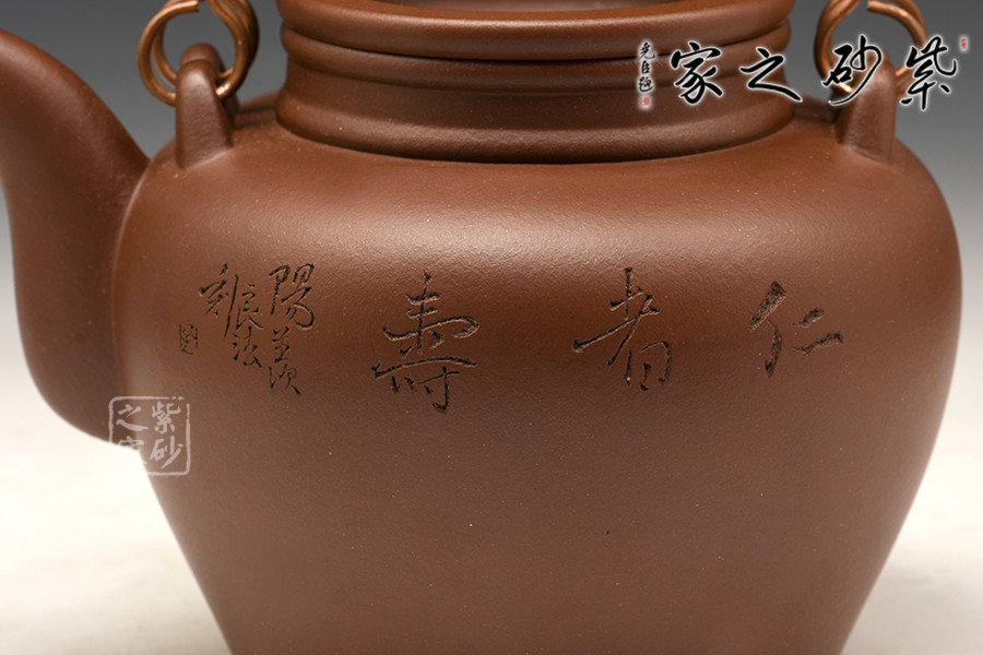 采用原礦紫泥泥料,通體暗紅發(fā)紫,素潔規(guī)整,圓融大氣,端莊敦厚,直頸高挺,上下沿起凸線,與凹嵌的壺蓋呼應(yīng);二彎流緊貼壺身,修長而有力度,壺嘴線條流暢,壺身雙面刻繪,一面刻牧童騎牛,一面書法“仁者壽”,落款良法刻。整器造型古樸,古韻盎然,莊重又不乏新意,典雅大氣又不失陽剛之氣,造型惹人喜愛。
