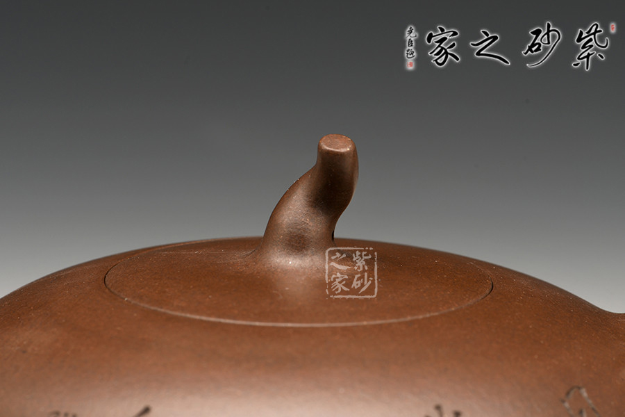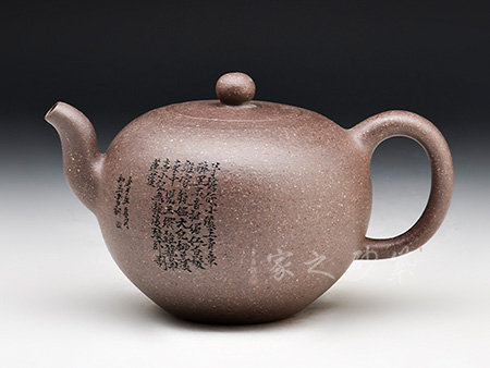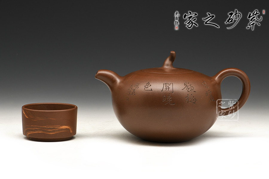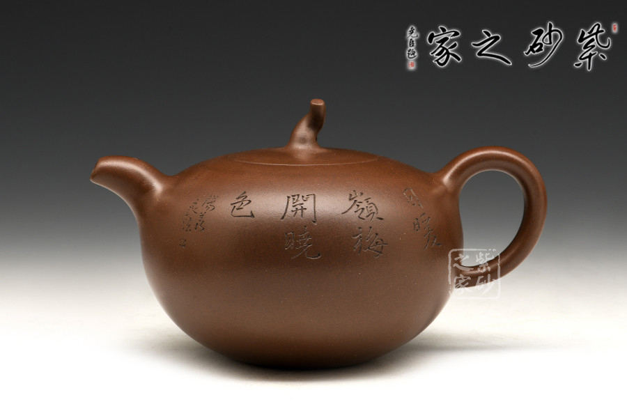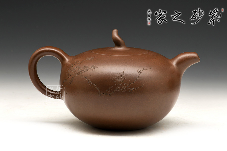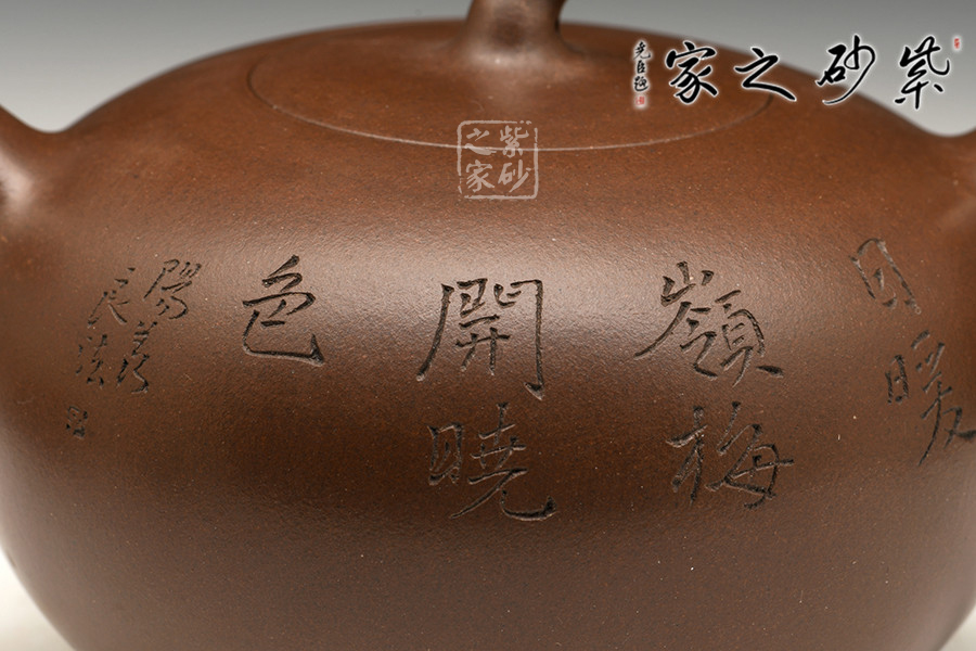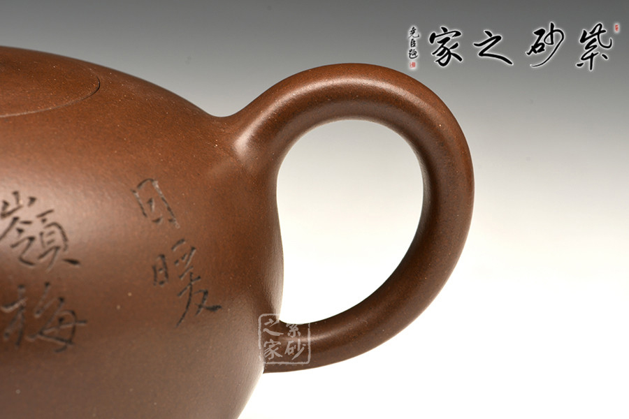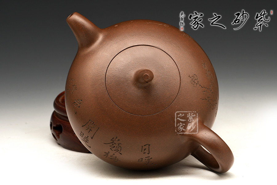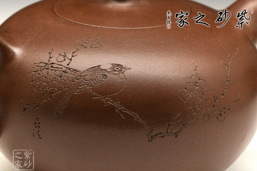 此款孔良法老說的《一粒珠》,壺身晶潤飽滿,型致迷人;暗接彎流,在橫向空間有所拉伸,襯托出壺身的造型,端口稍平,利于出、斷水;截蓋與壺身渾然一體,氣密性極佳;壺鈕與身筒一致,兩者形成一大一小兩粒晶潤的珠子,甚是可人;彎把曲度自然,簡潔明快,把執(zhí)適手;圈足穩(wěn)穩(wěn)的托起壺身,自然穩(wěn)重;雙面刻繪,正面書法“日暖嶺梅開曉色”,背面寒梅鳥雀一片春色盎然之象,可藏可玩,饋贈佳品。