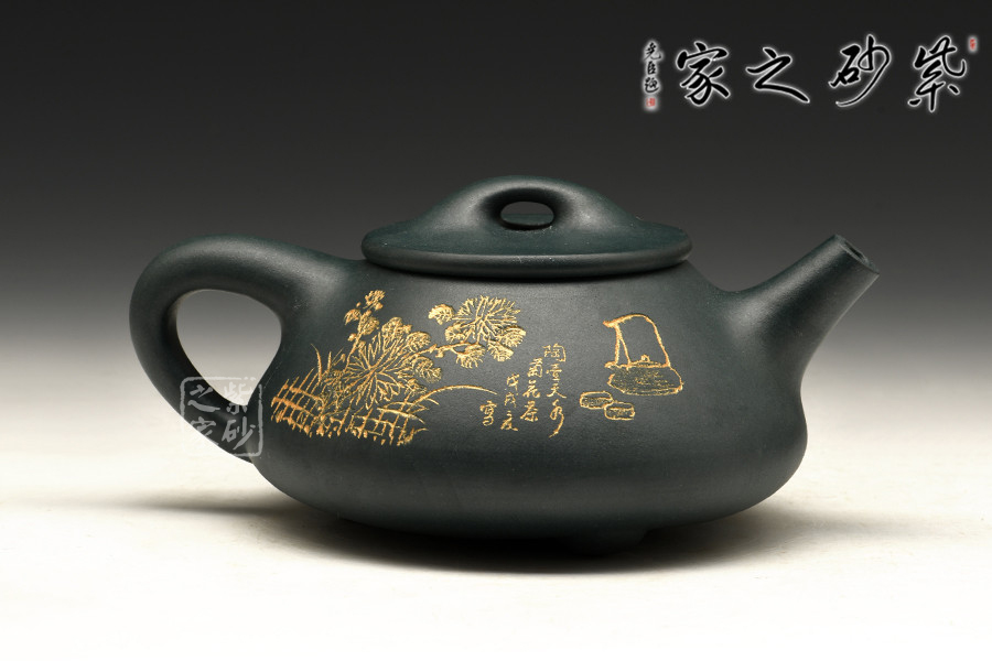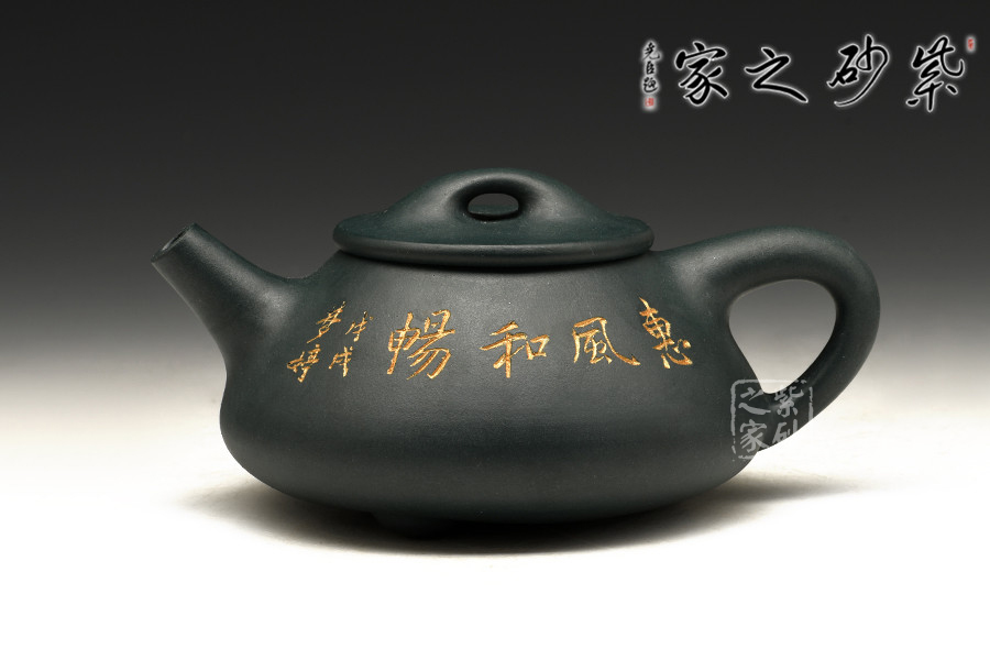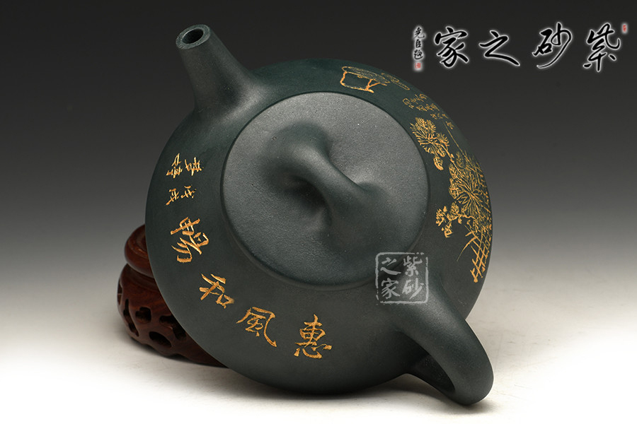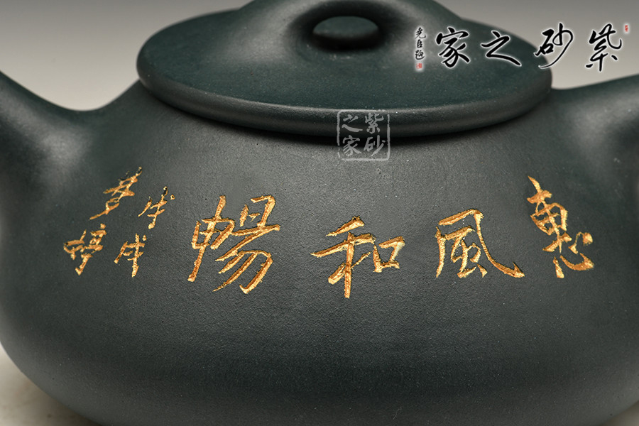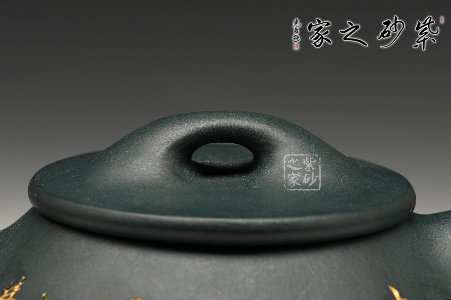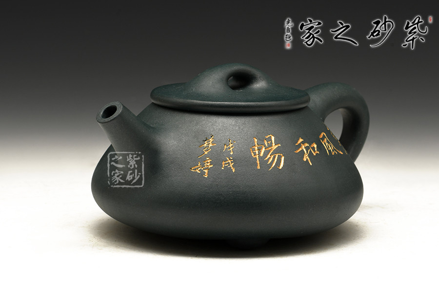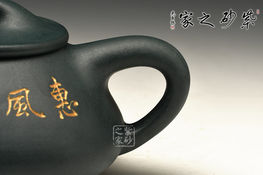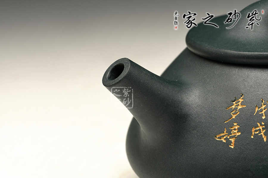 此款石瓢壺身為梯形,蓋為平頂式,橋型拱鈕,直流,壺嘴處平滑工整,出水流暢有力。作品點(diǎn)線面的整合在律動(dòng)中表現(xiàn)出視覺(jué)審美效果的放大,整器均勻端莊,骨肉亭勻,雋永耐看,具有一種優(yōu)雅古典之美,達(dá)到器型的標(biāo)準(zhǔn)要求“柔中寓剛”。上等泥料民國(guó)綠泥手制,泥質(zhì)細(xì)膩,色澤似翡綠,養(yǎng)成光滑溫潤(rùn)。