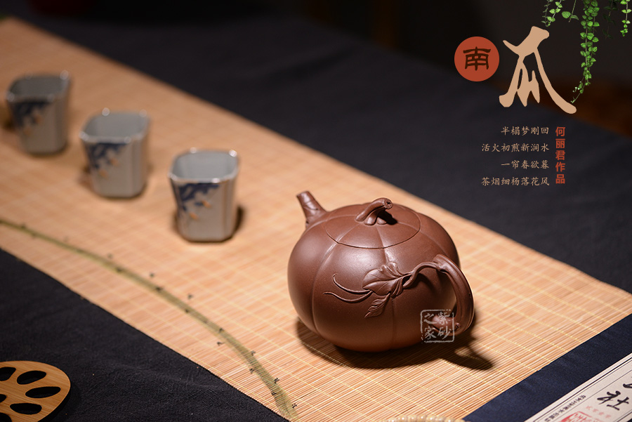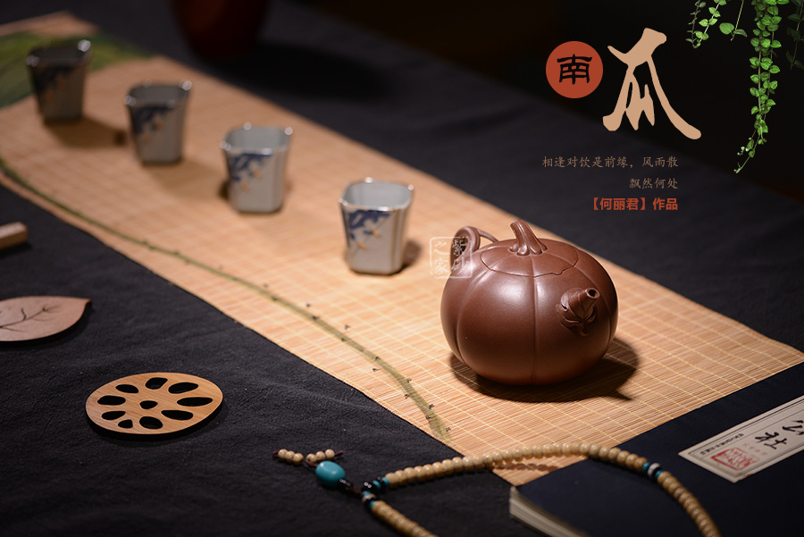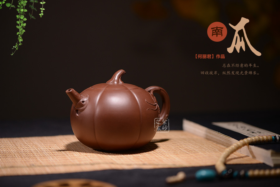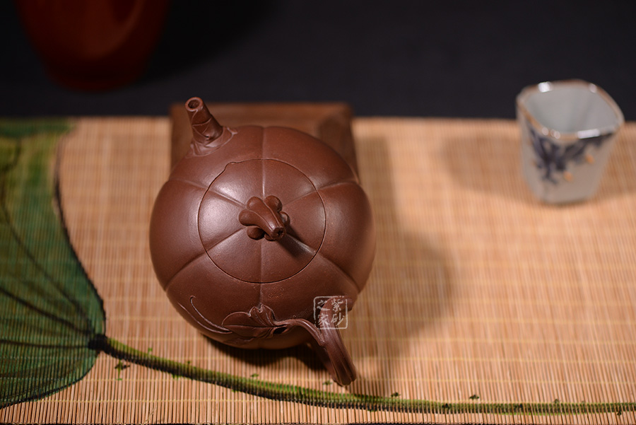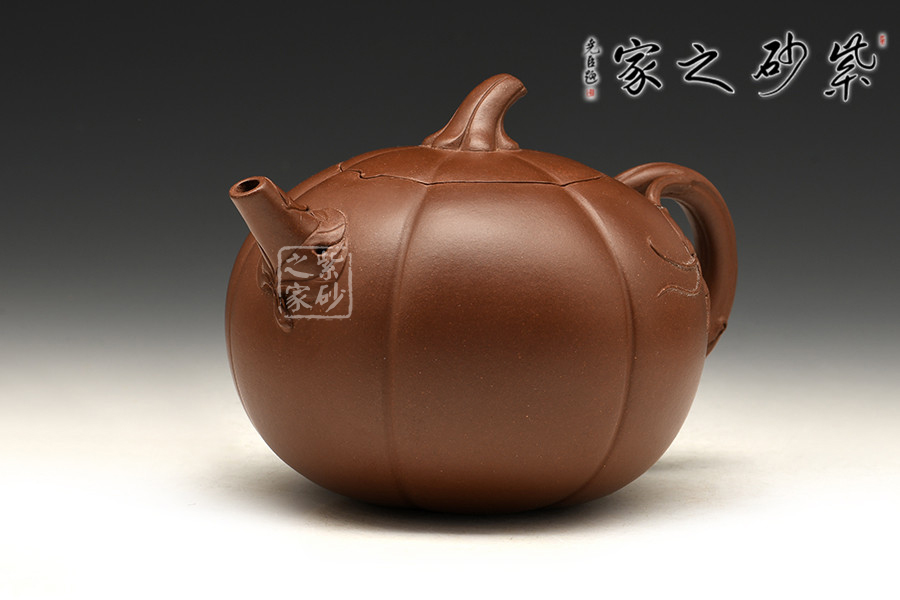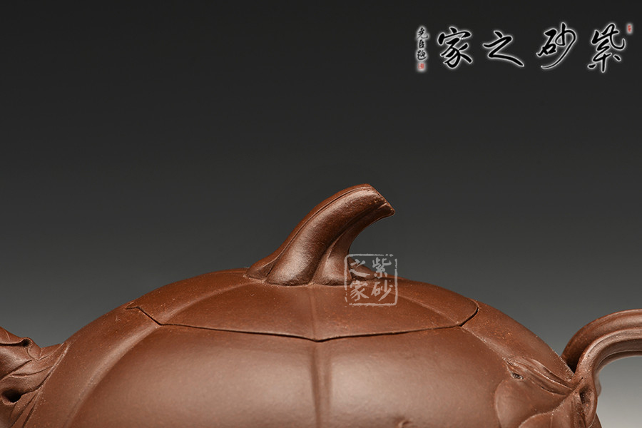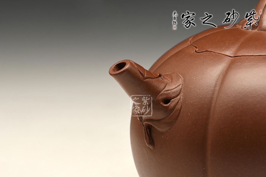 壺身上的筋紋力道恰當(dāng),疏密均勻,嵌入飽滿的壺身,使南瓜的成熟風(fēng)韻更顯明顯。與此同時,瓜嘴由捏塑的瓜葉自然卷曲而成,葉脈經(jīng)絡(luò)清晰逼真,瓜藤壺把,莖鈕,整器寓巧妙和美感于一體。
