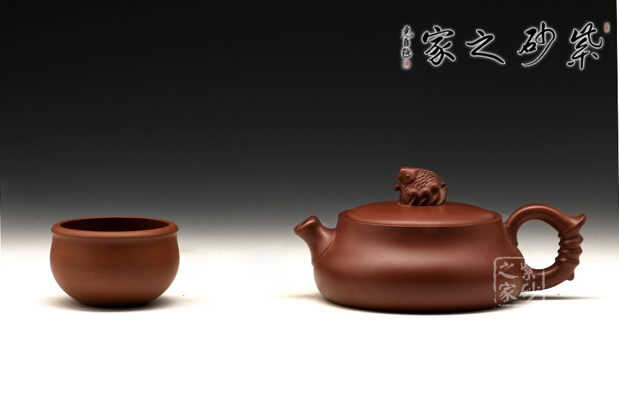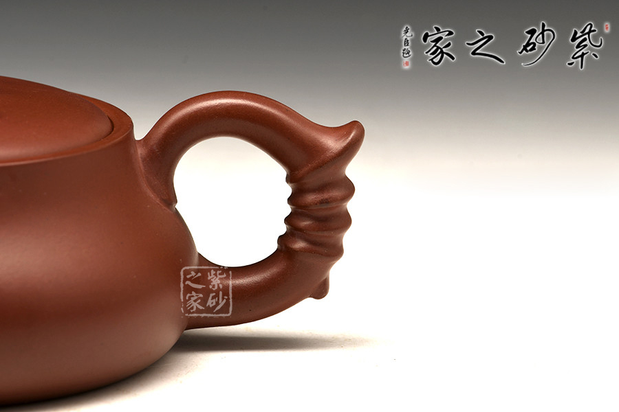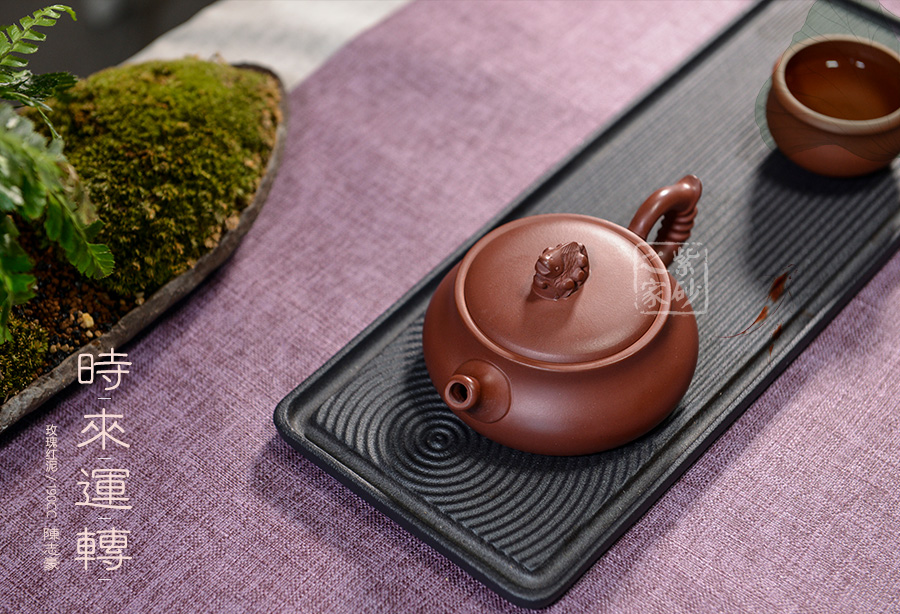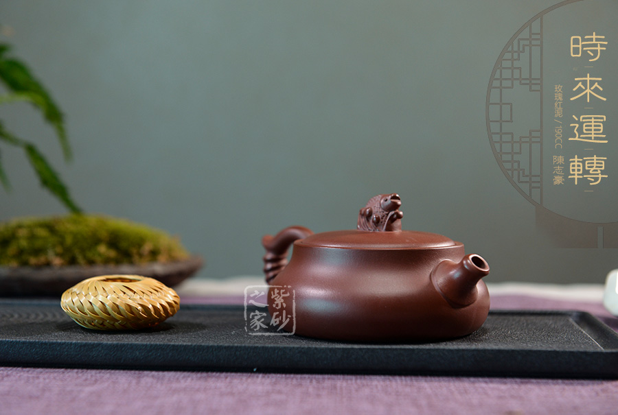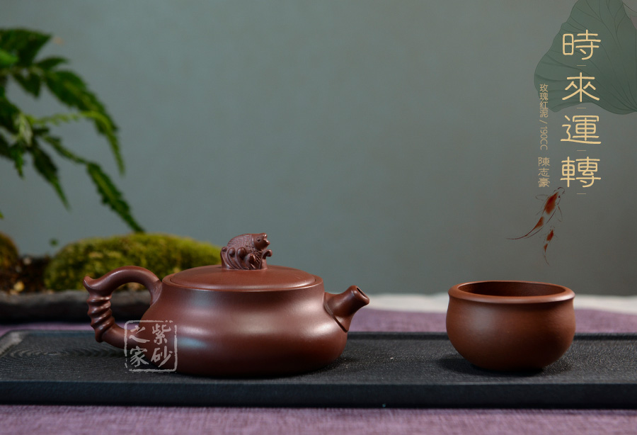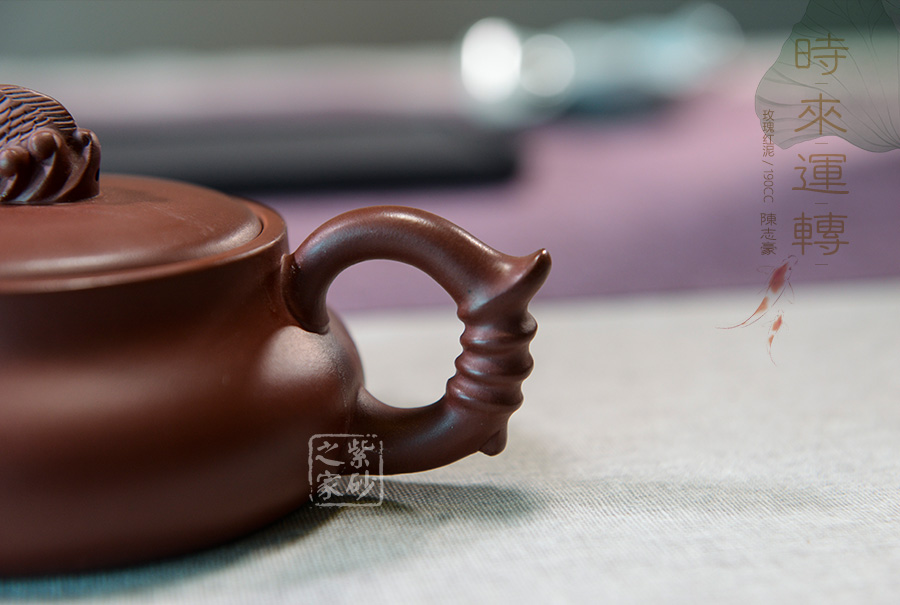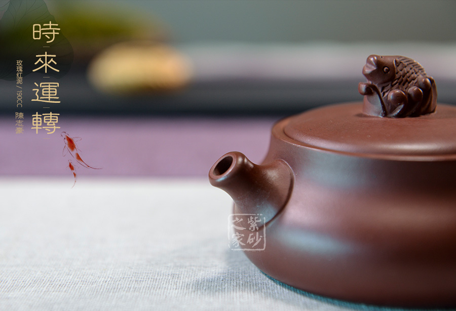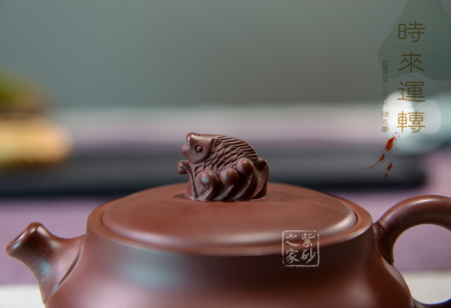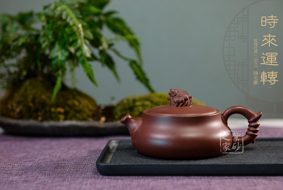 魚起魚落,時來運轉(zhuǎn)。這款為陳志豪老師時來運轉(zhuǎn)系列的矮壺,作品整體造型與虛扁壺相似,梅紅泥料制成,氣質(zhì)華貴,質(zhì)感極佳。