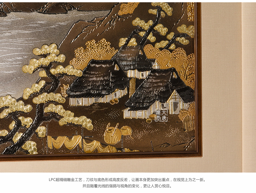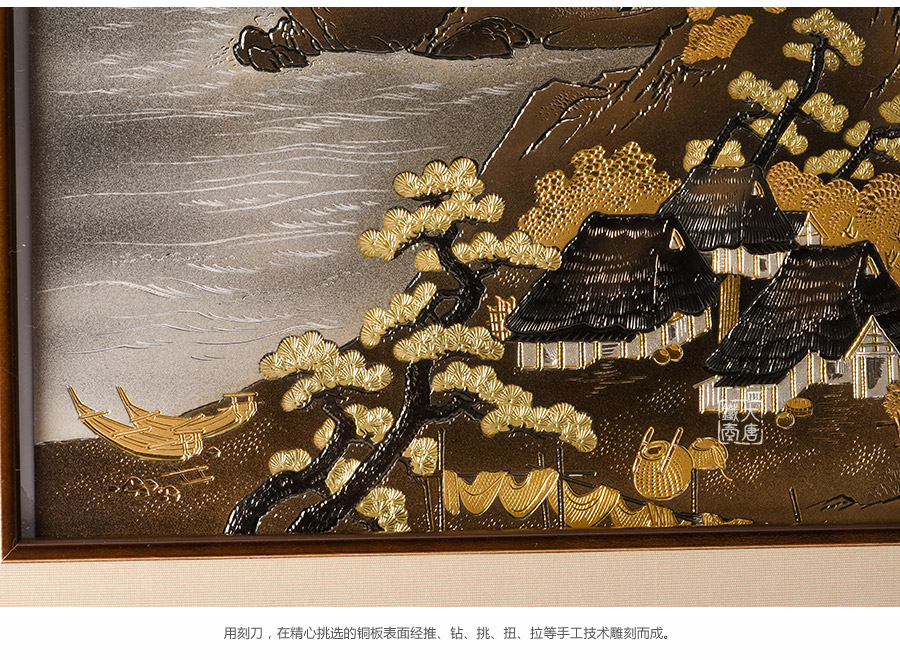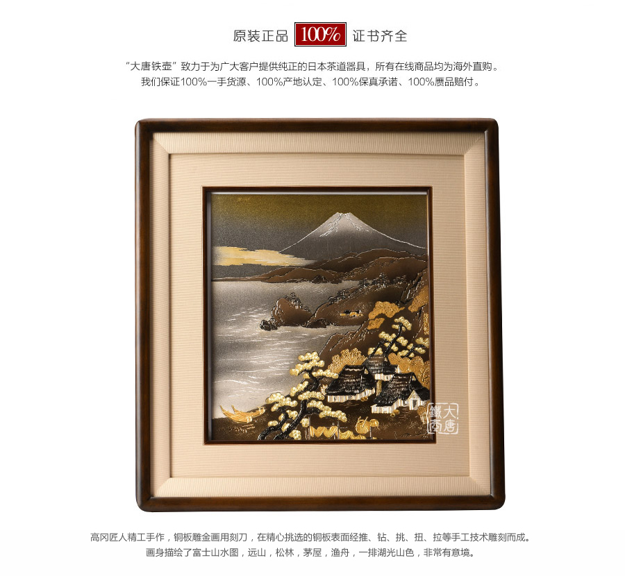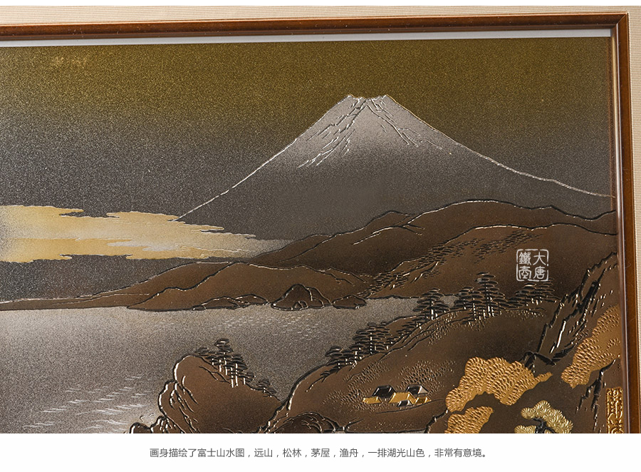 高岡匠人精工手作,銅板雕金畫用刻刀,在精心挑選的銅板表面經推、鉆、挑、扭、拉等手工技術雕刻而成。畫身描繪了富士山水圖,遠山,松林,茅屋,漁舟,一排湖光山色,非常有意境。