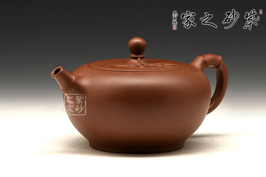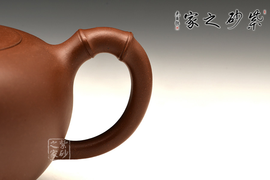 這款壺為扁圓壺,嵌蓋壓制其中,渾然一體。壺底至上而下收縮呈圈足底,穩(wěn)重自持。所謂“雅竹”,可以看到壺嘴、環(huán)把上的竹節(jié)形狀,彎曲勾勒線條流暢。還有至壺鈕生出,鋪于壺蓋蓋面的一支嫩竹,增添勃勃生機(jī)。竹是平安的象征,報(bào)竹平安,美好的祝愿。