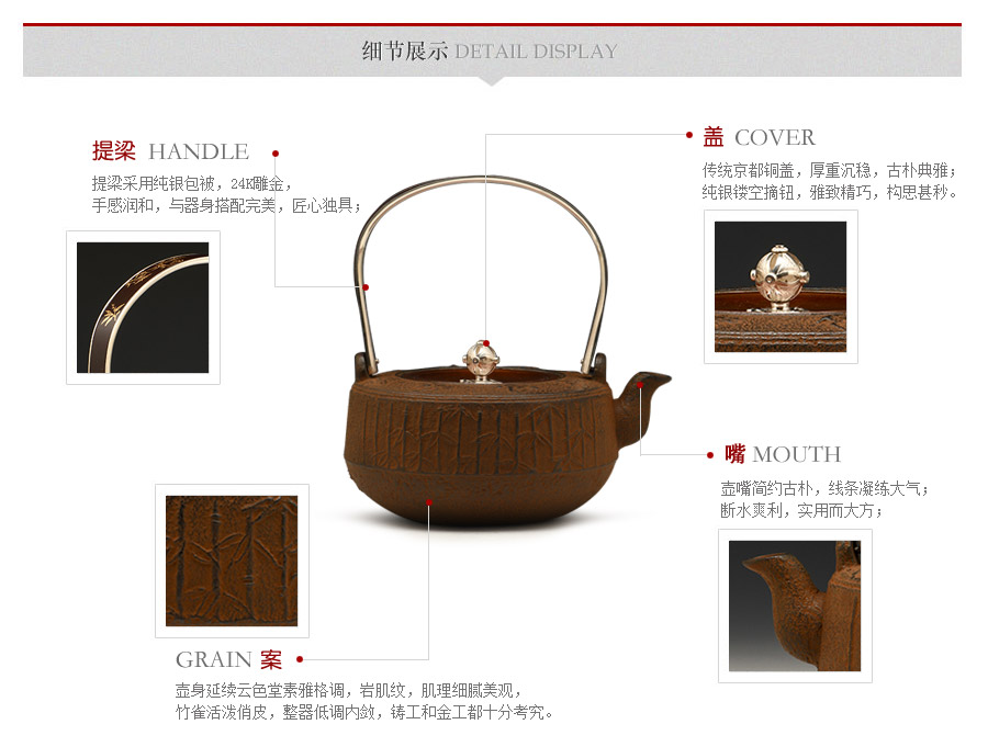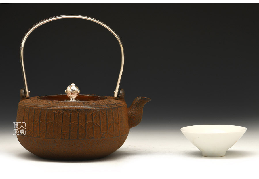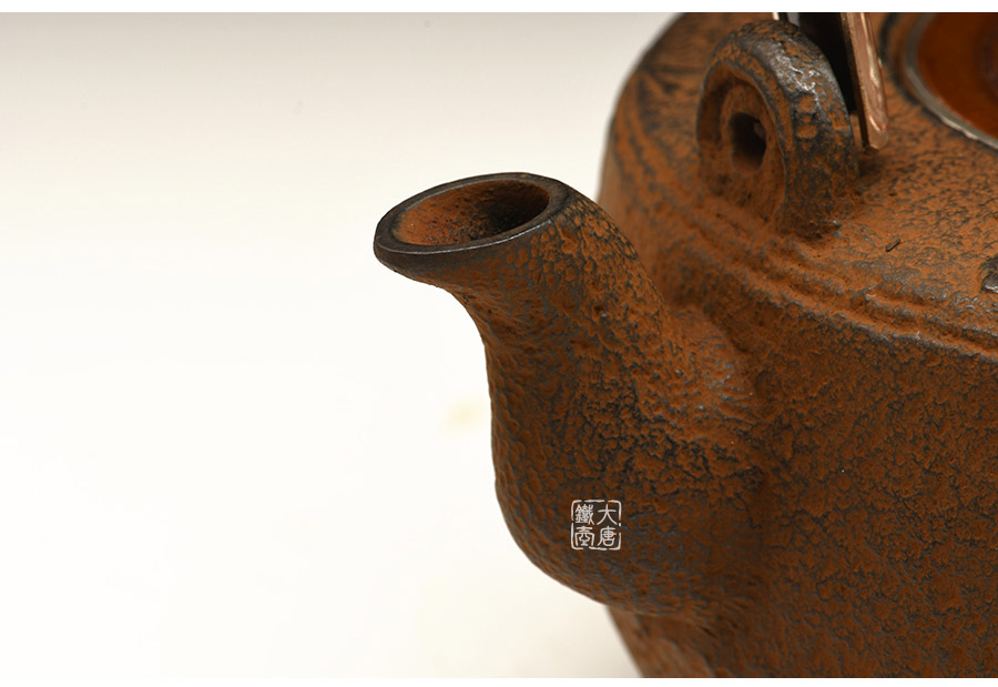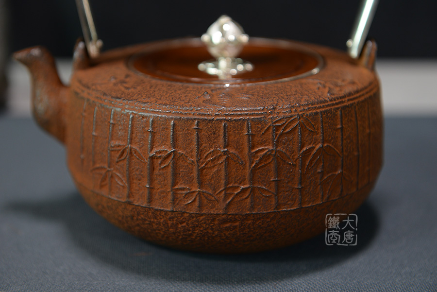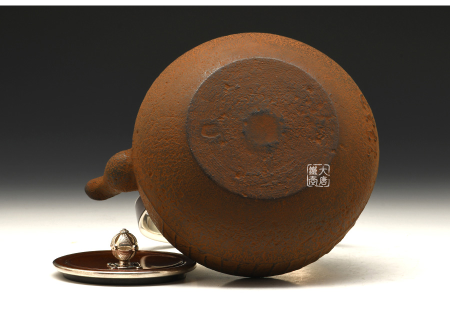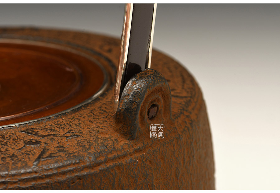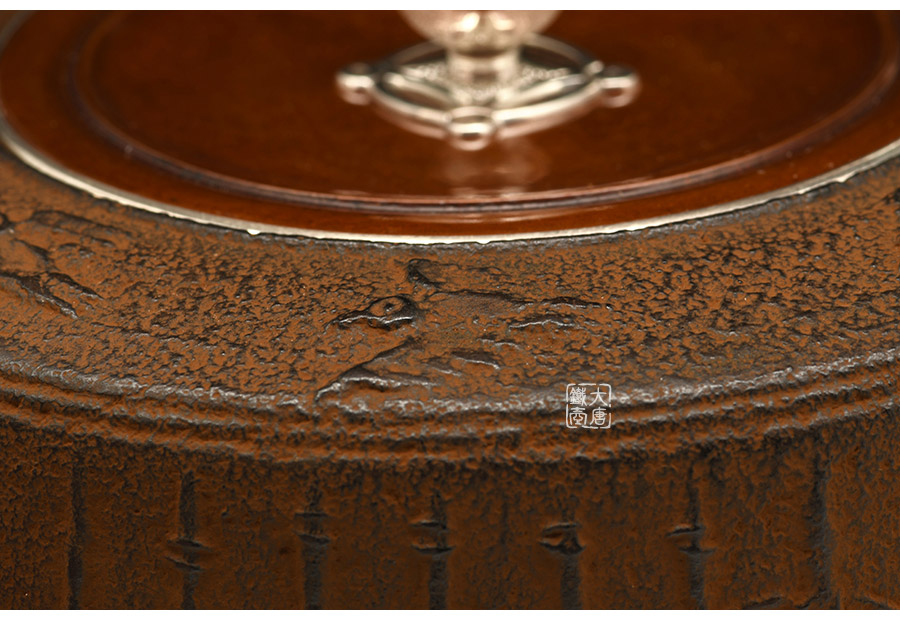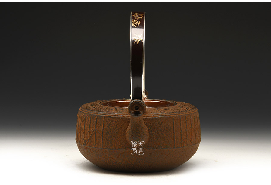 云色堂的鐵壺以豐美的裝飾技巧最為人稱道,描金及鑲金技術(shù)十分成熟。紋飾圖案的線條借鑒了日本古典瓷器的樣式。同時在一些細節(jié)的構(gòu)建上,云色堂也不惜使用珍貴的材料來彰顯他華貴的氣質(zhì)。在眾多堂口的鐵瓶中,這種特色使得其作品有很強的辨識性。
