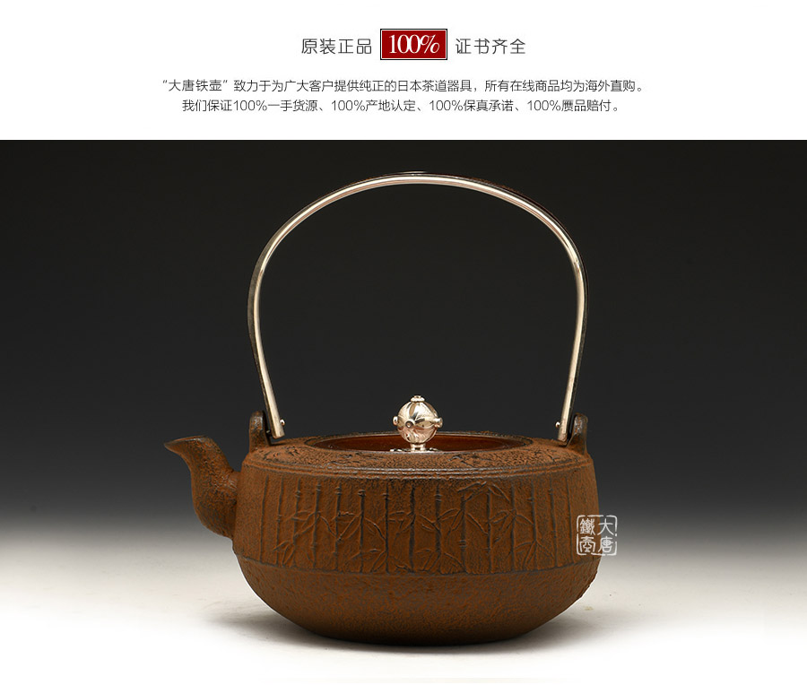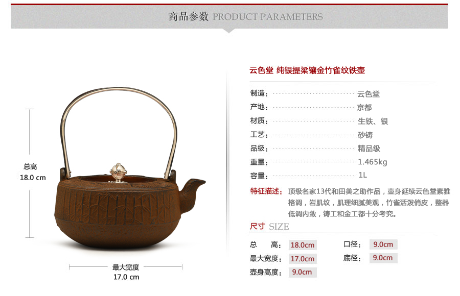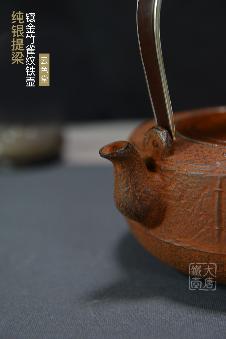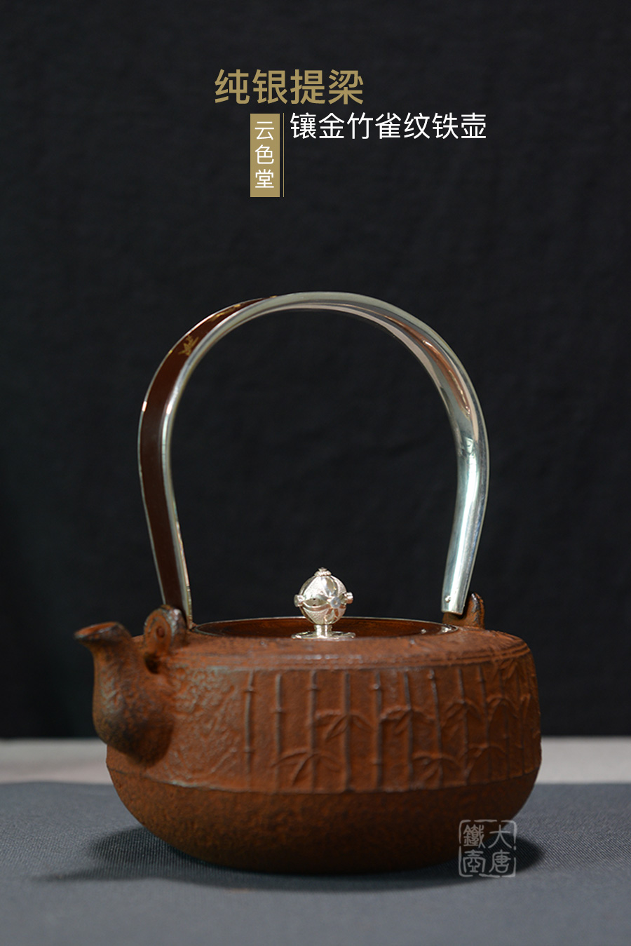 云色堂 純銀提梁鑲金竹雀紋鐵壺 [ 編號:66017 ]