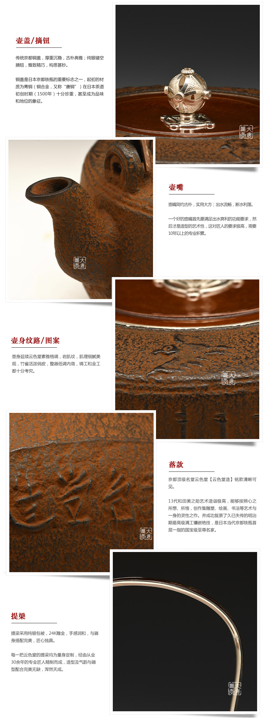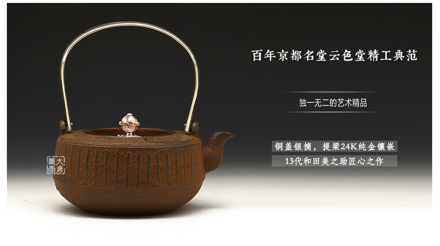 10代和田美之助親自前往雨宮金壽堂學(xué)習(xí)茶湯釜、鐵瓶的鑄造技法,深得京都鐵瓶的制作精髓。幾代人孜孜不倦努力,換來日益精進的技藝與作品?,F(xiàn)在每天云色堂的作品都會在各地展出。如今第13代傳人和田美之助傳承京都湯釜制作工藝,鉆研并改良京都鐵瓶的古法制作技術(shù),重現(xiàn)明治時期最高級京都鑲嵌鐵瓶。