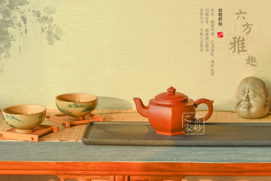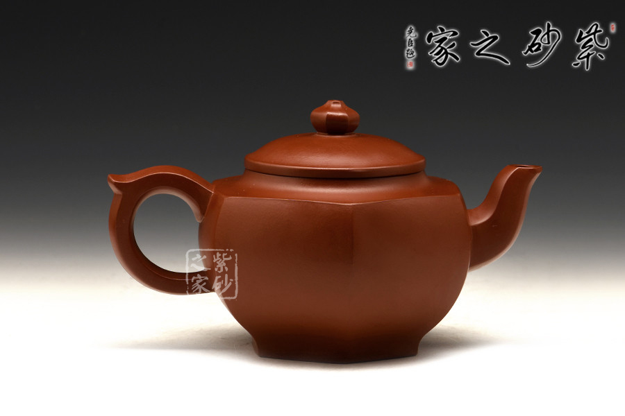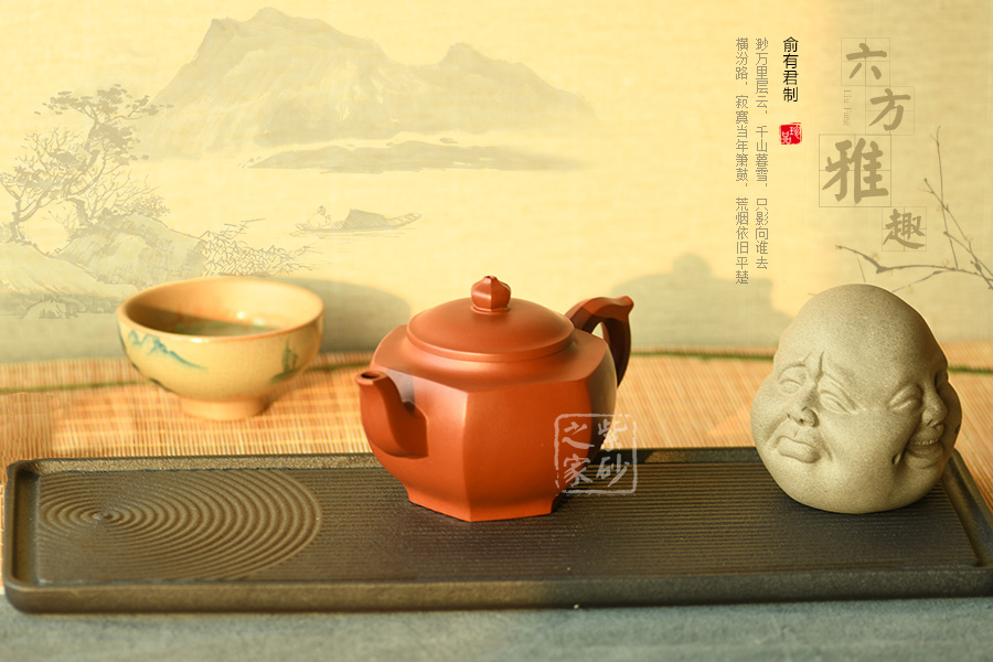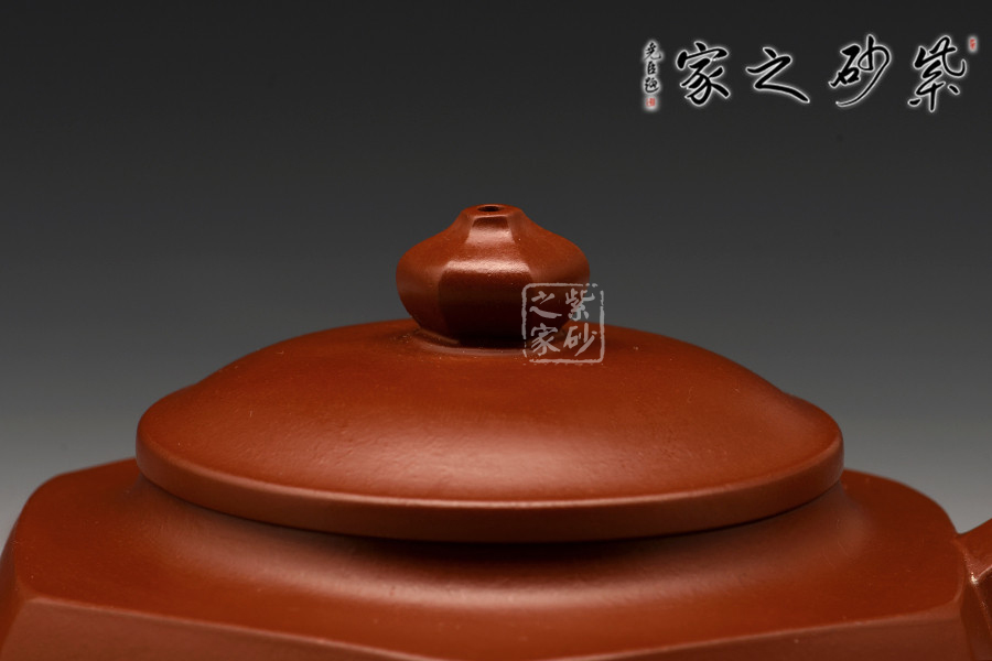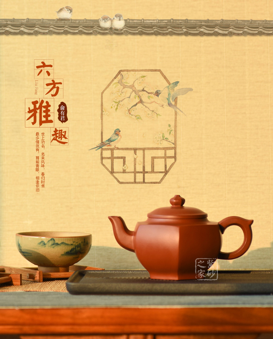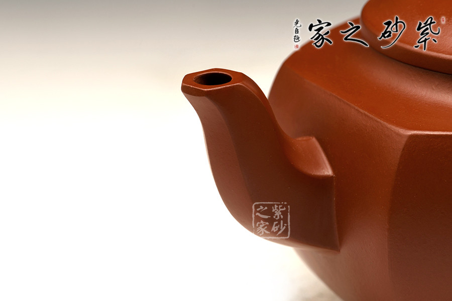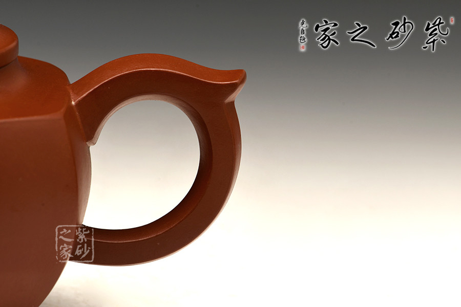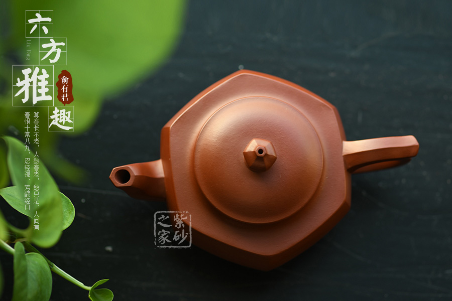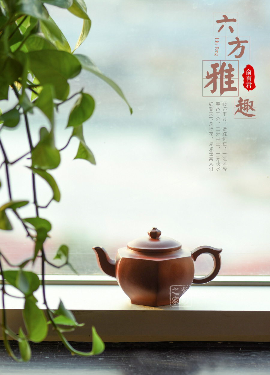 壺稱“六方雅趣”,六方明顯可見,壺身整體縱向均等分為六部分,但并不屬絕對(duì)的方器,方中有圓,方圓結(jié)合,既具有致韻律美,又不致過于嚴(yán)謹(jǐn)。至于“雅趣”,精致的壺鈕,三彎壺嘴,帶有一處飄逸手觸的環(huán)把,整壺設(shè)計(jì)比例恰當(dāng),不多一分不少一分,一切恰到好處。