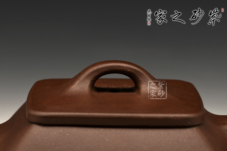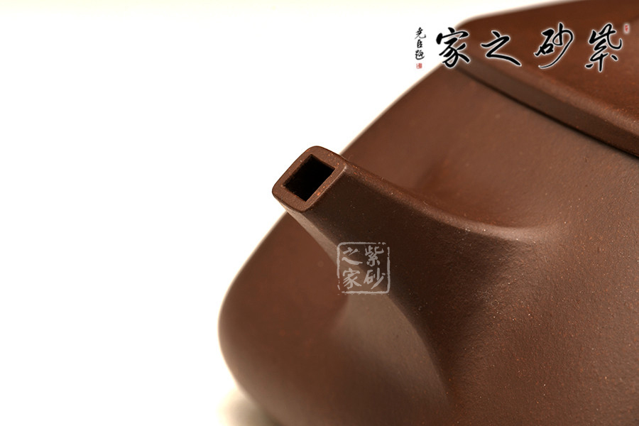 該壺壺身塊面往外凸而骨肉亭勻,塊面清晰,整器呈現(xiàn)出一種扎實(shí)飽滿、干凈利落的獨(dú)特氣質(zhì)。四方器型是方器之中最難制作和極為復(fù)雜的器型,極為考驗(yàn)制作者的功底。