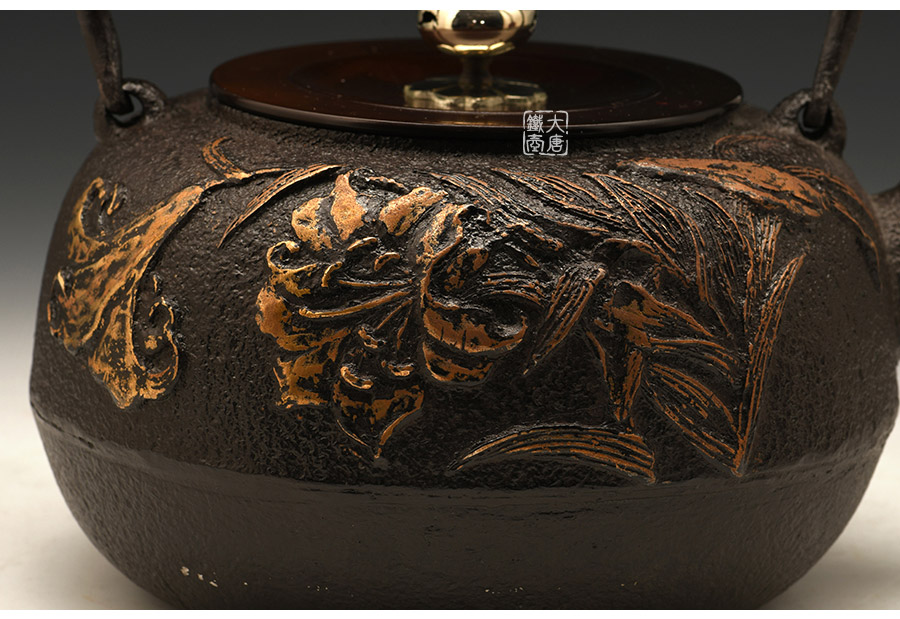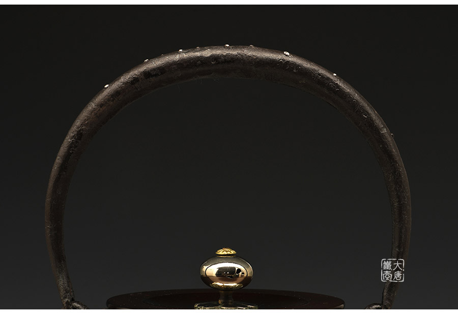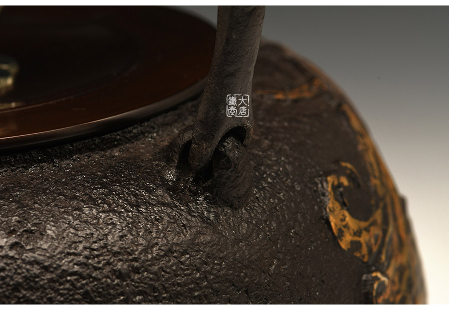 荒井工房的鐵瓶除了在鑄造工藝上有嚴(yán)格的規(guī)范和體系,在鐵瓶裝飾技術(shù)上也頗有建樹。除了傳統(tǒng)的印刻技術(shù)外,荒井工房還掌握了非常出色的金銀鑲嵌技藝,尤其以大片的鏨刻銀片最為出眾,這在山形當(dāng)?shù)靥每谥歇殬湟粠谩?/p>