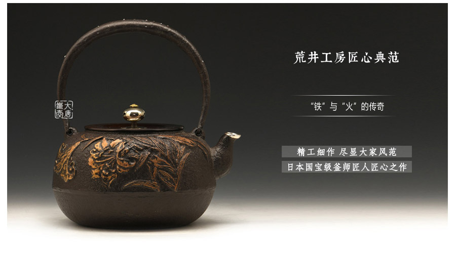 為了追求更為精致的紋理和細(xì)節(jié),當(dāng)代堂主荒井干雄孜孜不倦的將全部精力投入鐵瓶的創(chuàng)作之中,每一作品都經(jīng)由精心醞釀,純手工精心制作,不僅將荒井一家的祖?zhèn)骷妓嚢l(fā)揚光大,同時也在鐵瓶界闖出了自己的名聲,成為當(dāng)代的釜師名家。