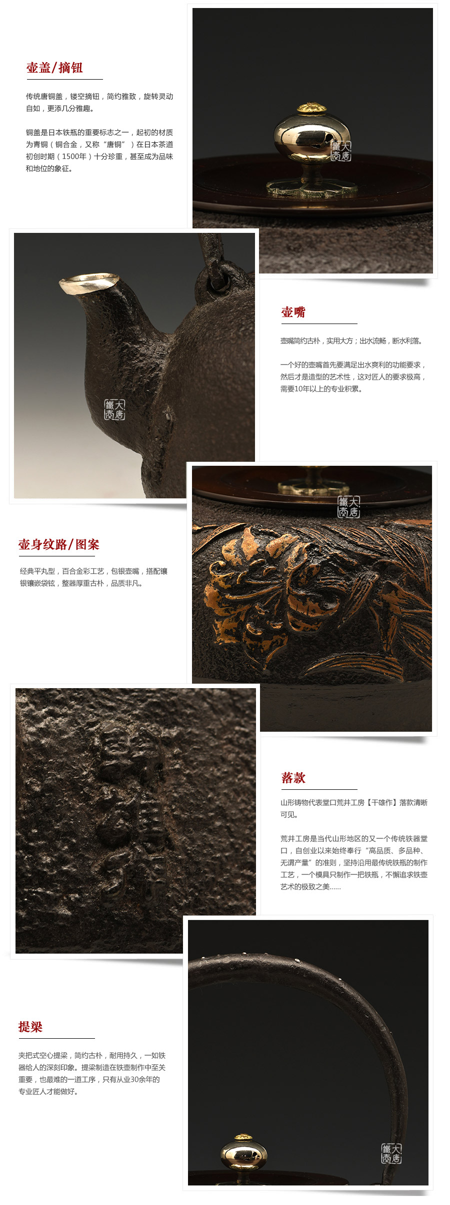 荒井工房是當(dāng)代山形地區(qū)的又一個傳統(tǒng)鐵器堂口,自創(chuàng)業(yè)以來始終奉行“高品質(zhì)、多品種、無謂產(chǎn)量”的準(zhǔn)則,堅持沿用最傳統(tǒng)鐵瓶的制作工藝,一個模具只制作一把鐵瓶,不懈追求鐵壺藝術(shù)的極致之美……