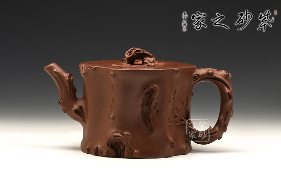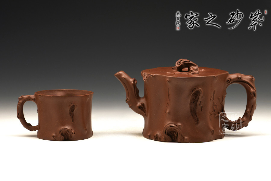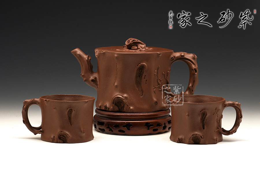 作品運(yùn)用雕、塑、捏、貼等手法,展現(xiàn)樹樁蒼勁硬朗的氣勢(shì),形象逼真的勾勒出樹樁的紋理,扭曲斑駁、變化無窮、自然貼切、古樸大方。壺嘴、壺蓋、壺把也化作枯枝效果,然而把手處伸出的一條嫩枝,卻帶來了無限的生機(jī)。此茶具套組,古樸厚實(shí),端莊靈動(dòng),從構(gòu)思到表現(xiàn),恰如其分,極具深層內(nèi)涵。