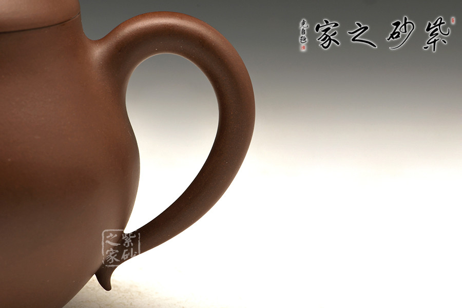 梨形壺,因造型類似梨而得名,是一款非常經(jīng)典的壺型。作品壺體勻稱,器身飽滿,口蓋較大。梨莖鈕微彎,別致可愛,壺把半圓弧彎曲自然,線條流暢優(yōu)美。此壺造型簡約之外,造工一絲不茍,整體比例協(xié)調(diào),造型端莊俊雅卻不失靈動,為難得上佳茗壺。吃梨,清心,品茗更清心靜心!