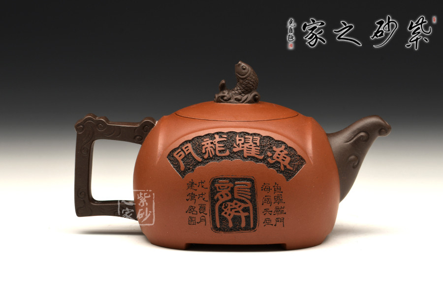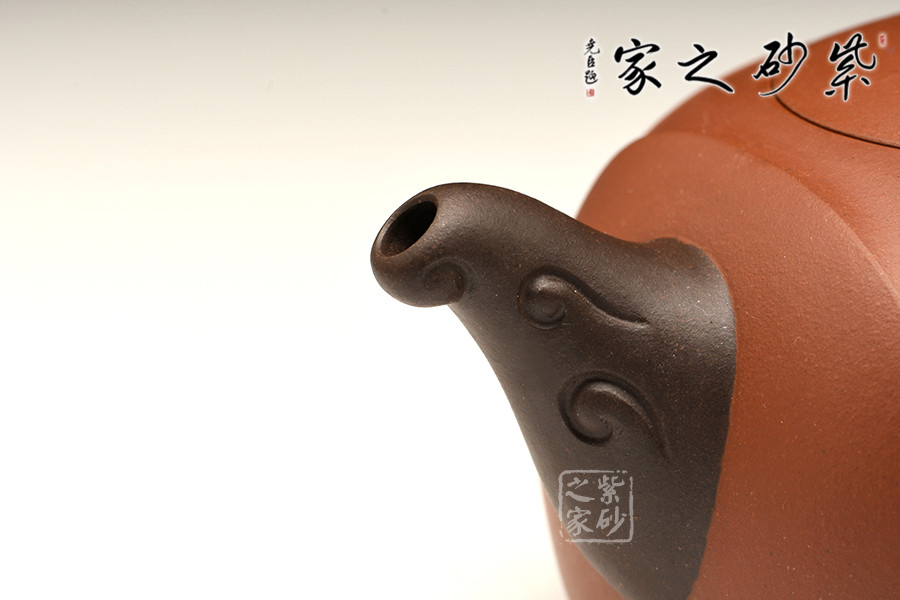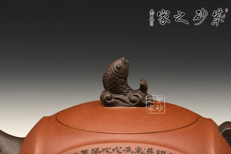 此壺設計巧思,造型華美大方,壺身為圓形,彎嘴方把,以躍起的“錦鯉”為鈕。嘴把鈕色澤一致,與整壺其他色調和諧,更顯“雙色泥”韻致。