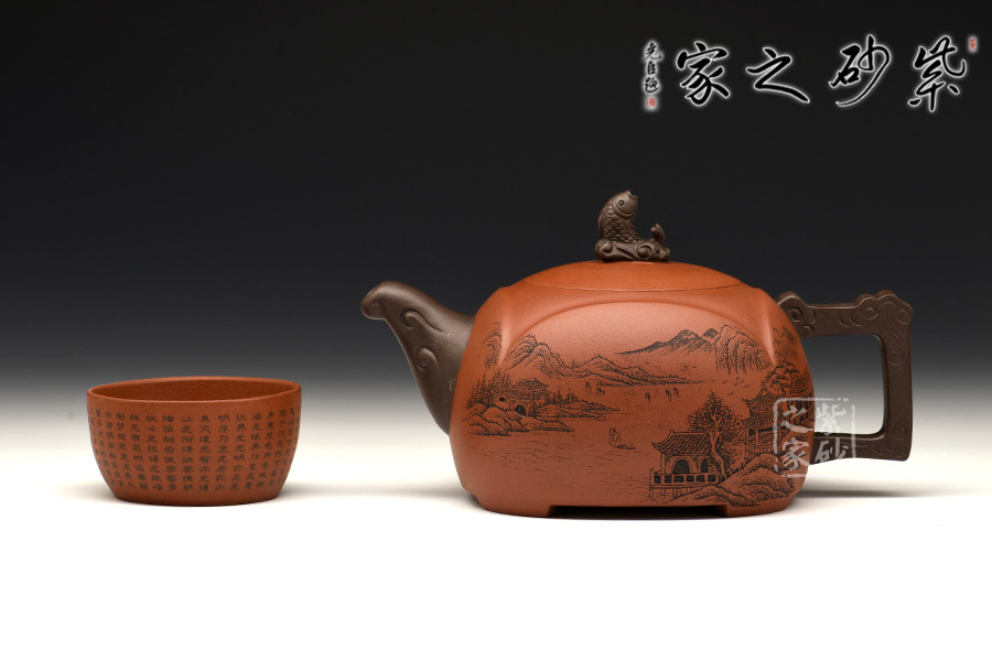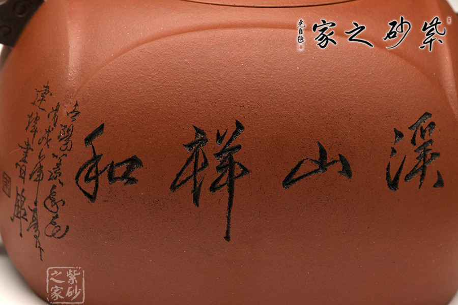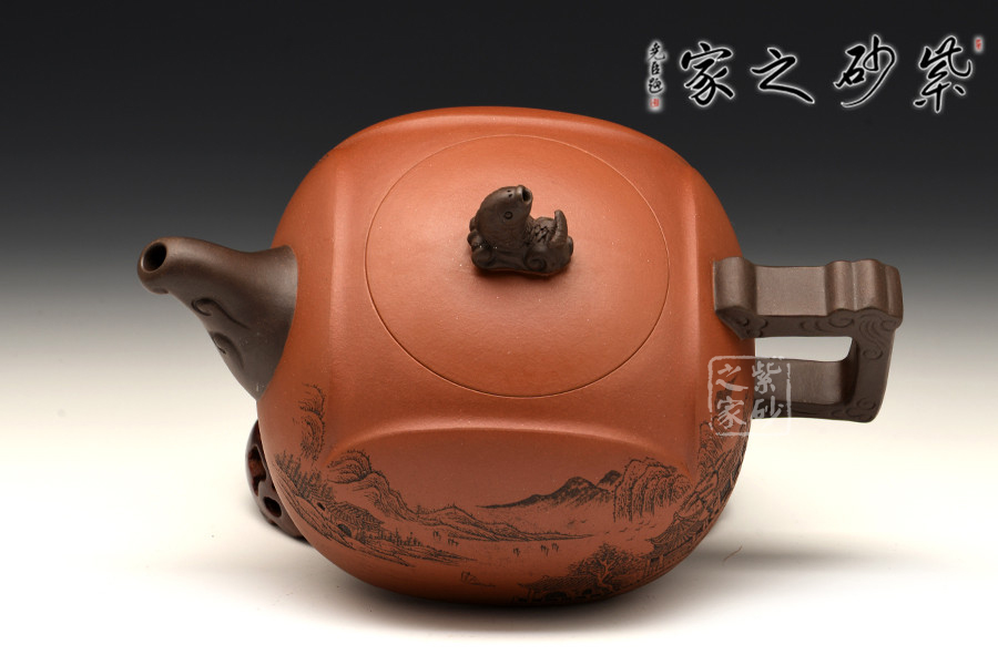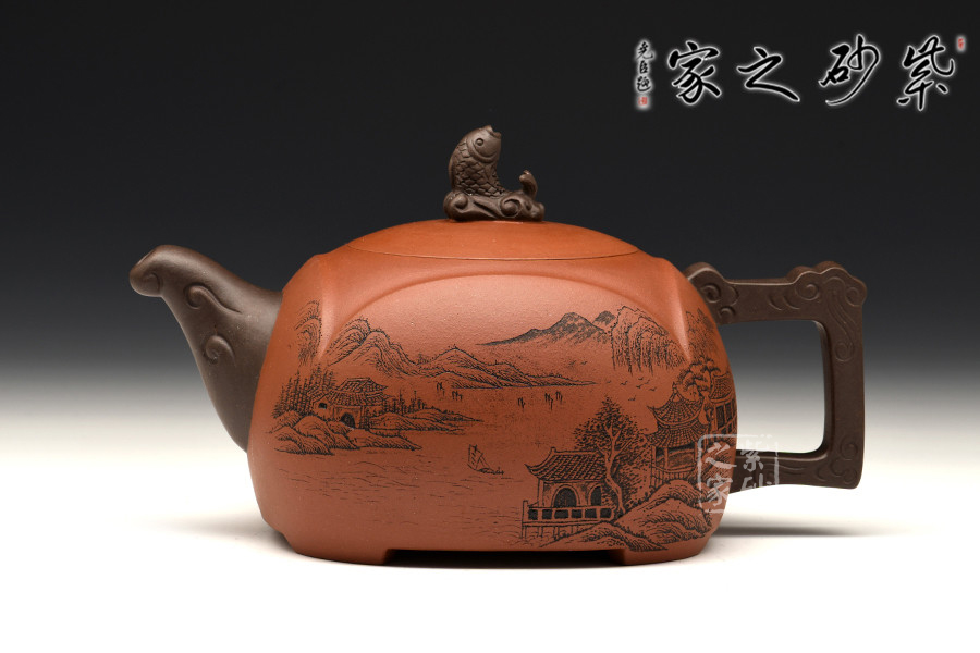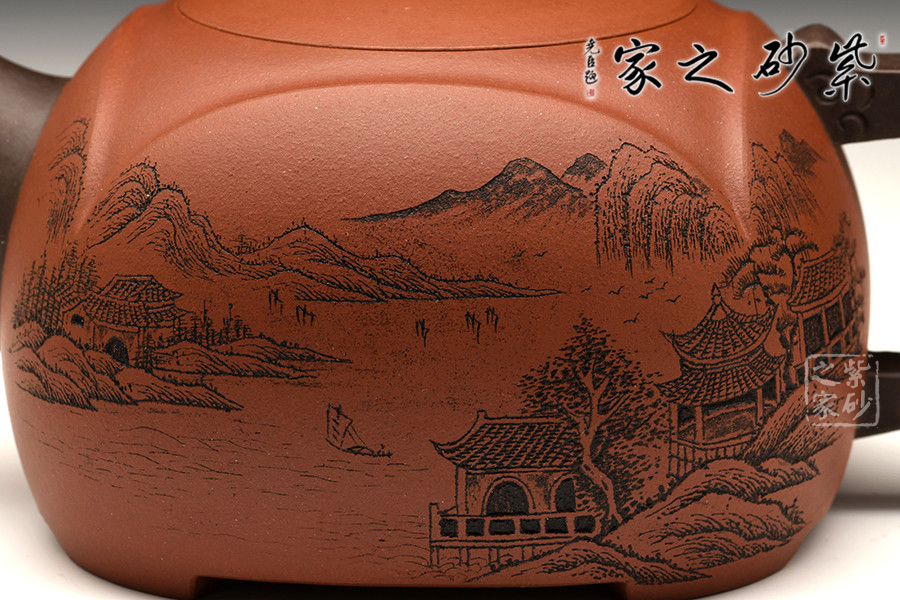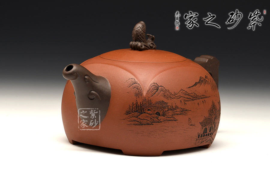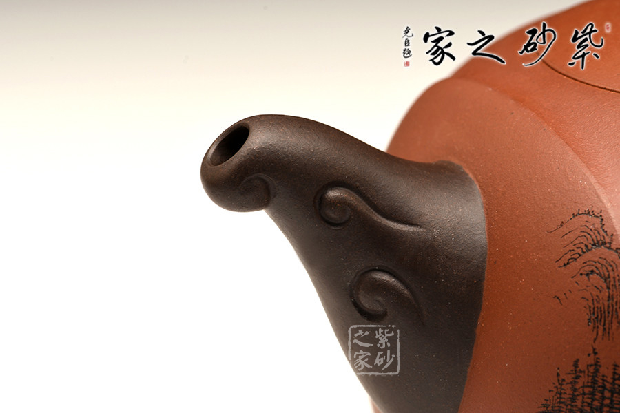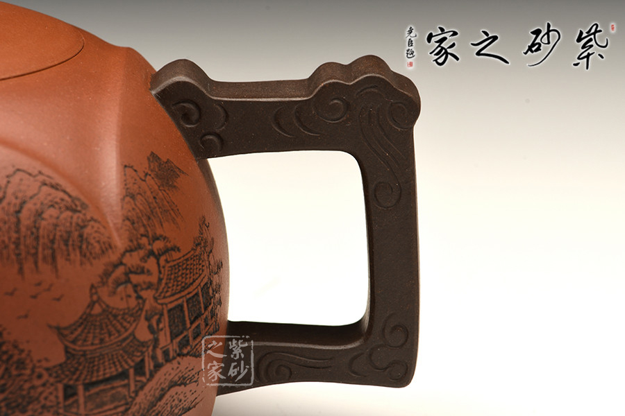 作品刻畫精細(xì)而不繁瑣,塊面清晰簡潔,線條流暢明快,壺身書畫裝飾,“溪山祥和”,山水之景,觀感為之胸襟一開,暢快舒適!