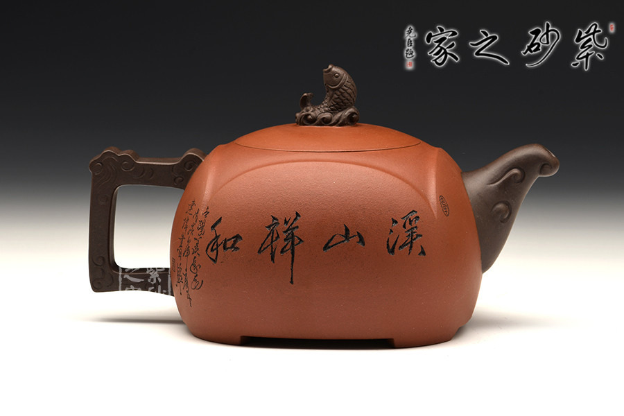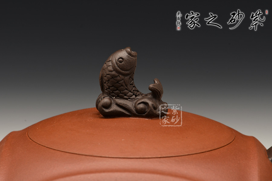此壺設(shè)計(jì)巧思,造型華美大方,壺身為圓形,彎嘴方把,以躍起的“錦鯉”為鈕,別致可愛。嘴把鈕色澤一致,與整壺其他色調(diào)和諧,更顯韻致。