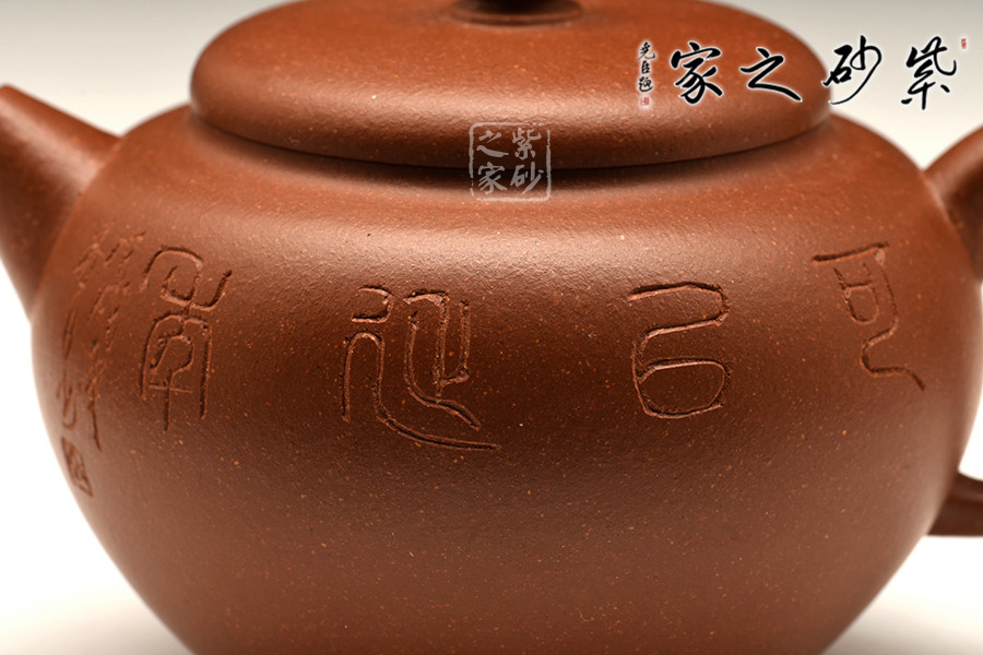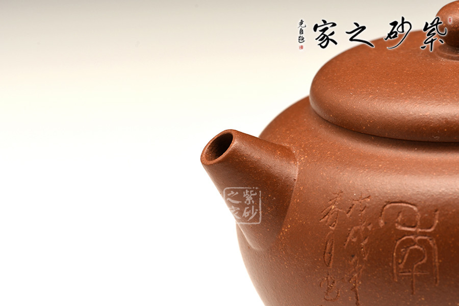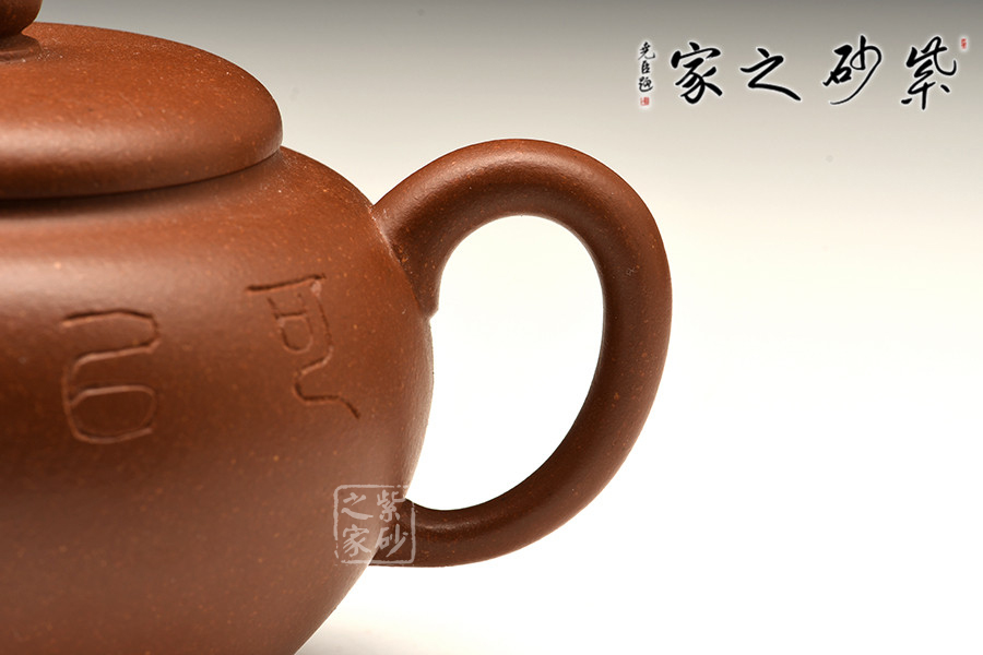 此壺有著渾圓的壺身,渾圓的壺鈕,比例得當(dāng),簡(jiǎn)練大方,制作頗見功力。直流嘴胥出,玲瓏可愛,柔美之姿明顯。壺柄略微上抬之后優(yōu)雅滑落而下,形成一條圓潤(rùn)飽滿的耳形弧線,樸雅大方。