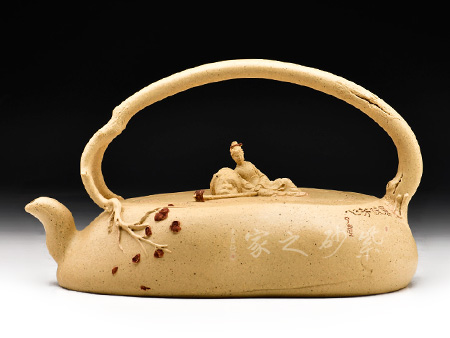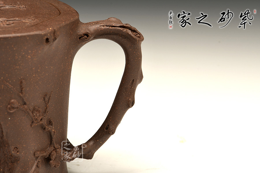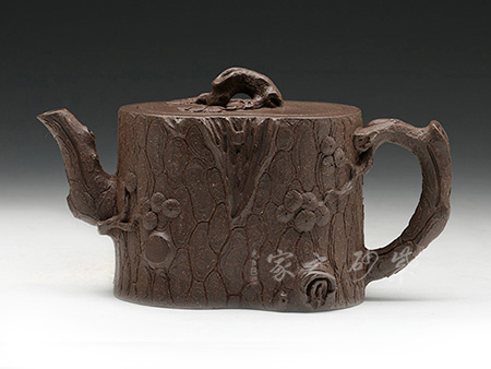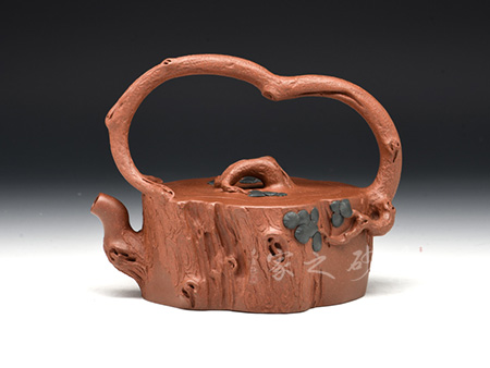 作品壺身、流、把、鈕全部是用極富生態(tài)的殘梅樁及纏枝組成,采用堆花手法,將桂花砂泥漿堆積塑造成型,栩栩如生,觀之強(qiáng)而有力。