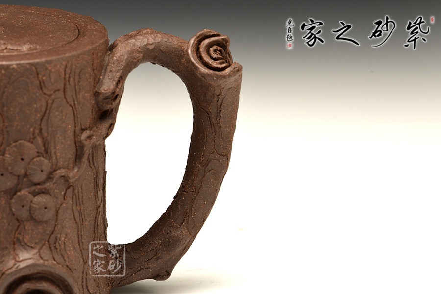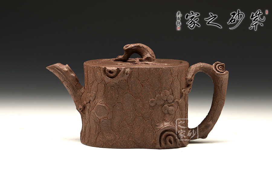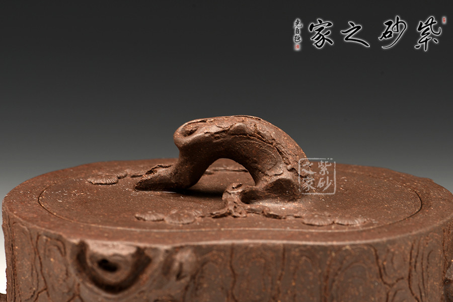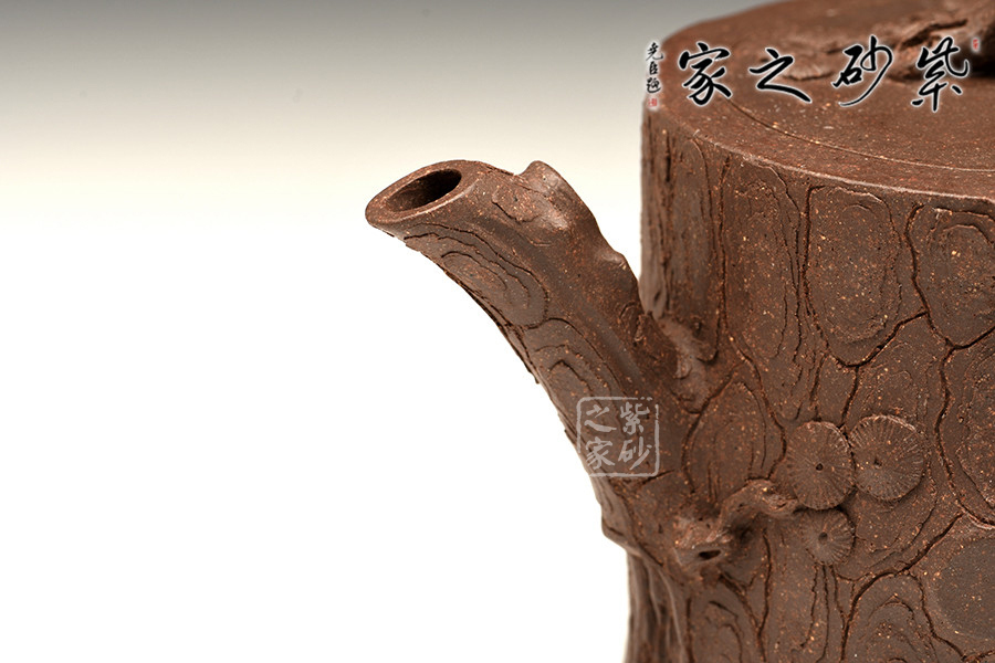 作品壺身、壺嘴、壺把、壺鈕均以松樁形展現(xiàn),穩(wěn)妥古拙、枝干蒼勁,樹皮刻畫嶙峋有致,疤節(jié)、皺褶、裂紋和突起均處理的十分細膩,體現(xiàn)出一種錯落而又統(tǒng)一的美感。