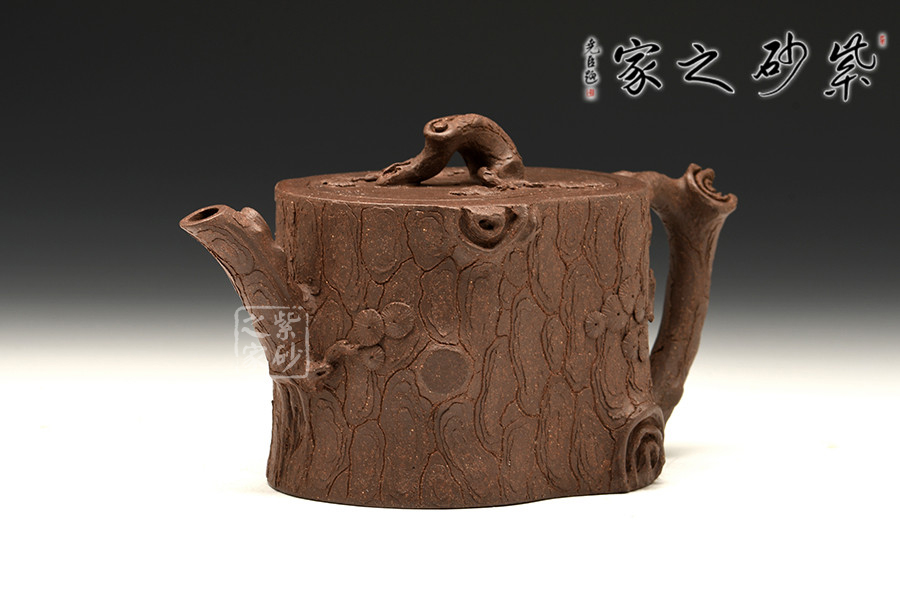 松樁壺是花貨中的傳統(tǒng)壺形,這把“鳴遠松樁”將松樁斑駁而不失蒼勁的形象特點淋漓盡致的轉(zhuǎn)化到壺上,同時取宏用精,選擇性的強化了樹皮的結(jié)痂和裂紋,給人一目了然的松樁效果。