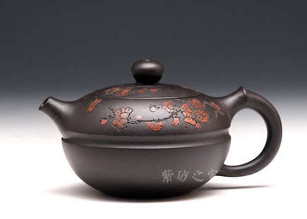 壺身以梅花為形,器型端莊精致,堪稱雅致,幽幽生香。作品屬于筋紋器壺型,通壺制作審慎,工精藝謹(jǐn)。由蓋鈕到壺身,每一處轉(zhuǎn)折線角明確清晰,筋囊工整勻稱,相互間又一氣貫通。