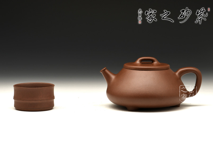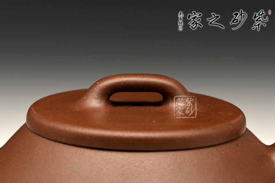 這款壺造型不顯銳感,盡顯文人般的儒雅。其身梯形、底置三足,其蓋為石瓢獨(dú)有的橋鈕,弧線流暢自然,整個器型顯沉穩(wěn)大度。