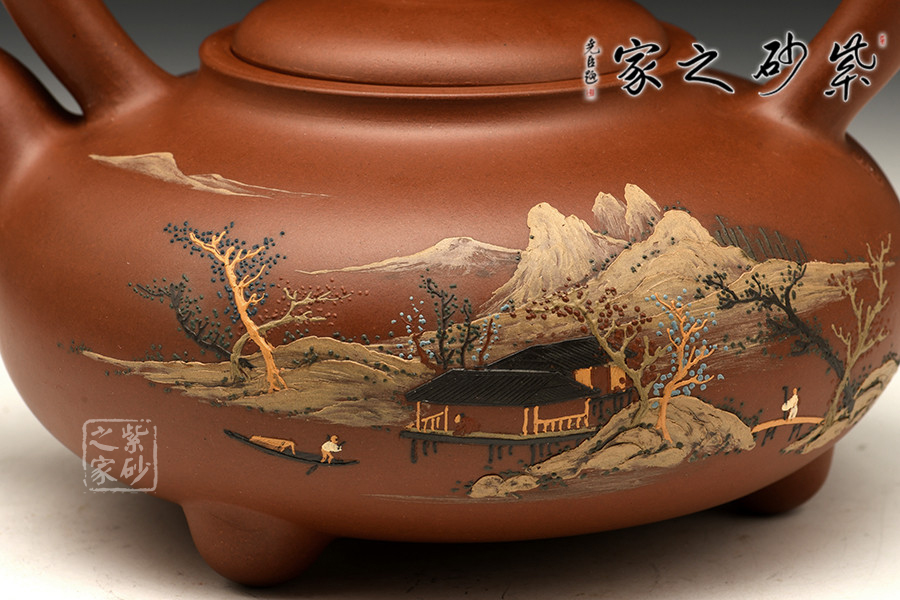 壺身以泥繪山水圖案裝飾,“草堂幽事許誰(shuí)分?石鼎茶煙隔戶聞”表現(xiàn)裝飾意境。