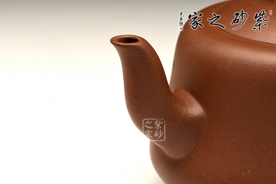 這款壺敦實(shí)古樸,造型別致,實(shí)用性佳的同時(shí)也兼具藝術(shù)美感。壺身圓柱形,但上斂下豐,底部成圈足,端方穩(wěn)重。三彎流嘴和飛把皆形態(tài)優(yōu)美,曲線過(guò)渡極其流暢自然,加上嵌蓋拱形鈕,整壺精氣神韻俱佳。