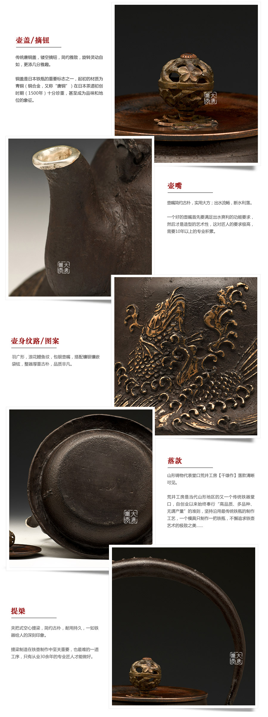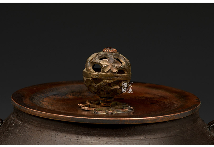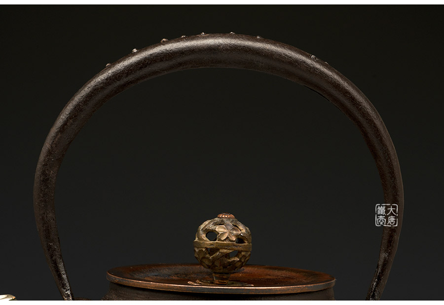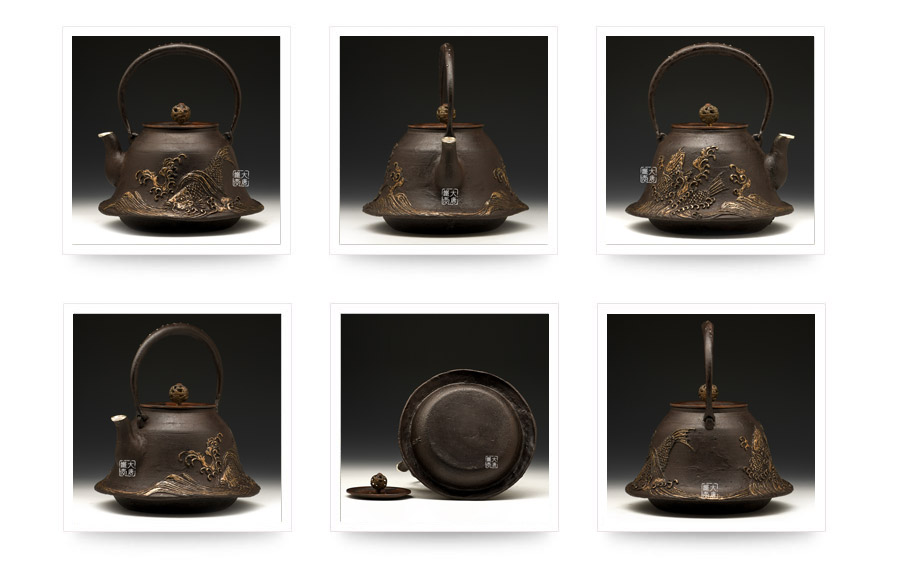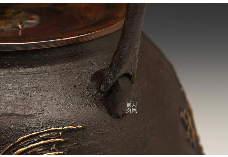 荒井工房的鐵瓶除了在鑄造工藝上有嚴(yán)格的規(guī)范和體系,在鐵瓶裝飾技術(shù)上也頗有建樹。除了傳統(tǒng)的印刻技術(shù)外,荒井工房還掌握了非常出色的金銀鑲嵌技藝,尤其以大片的鏨刻銀片最為出眾,這在山形當(dāng)?shù)靥每谥歇?dú)樹一幟。