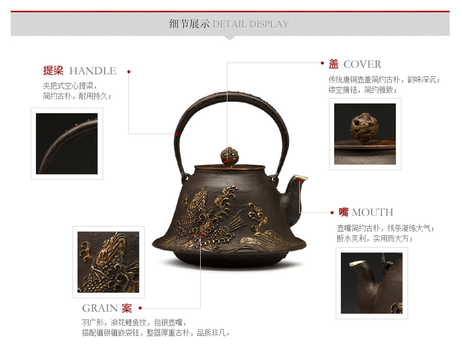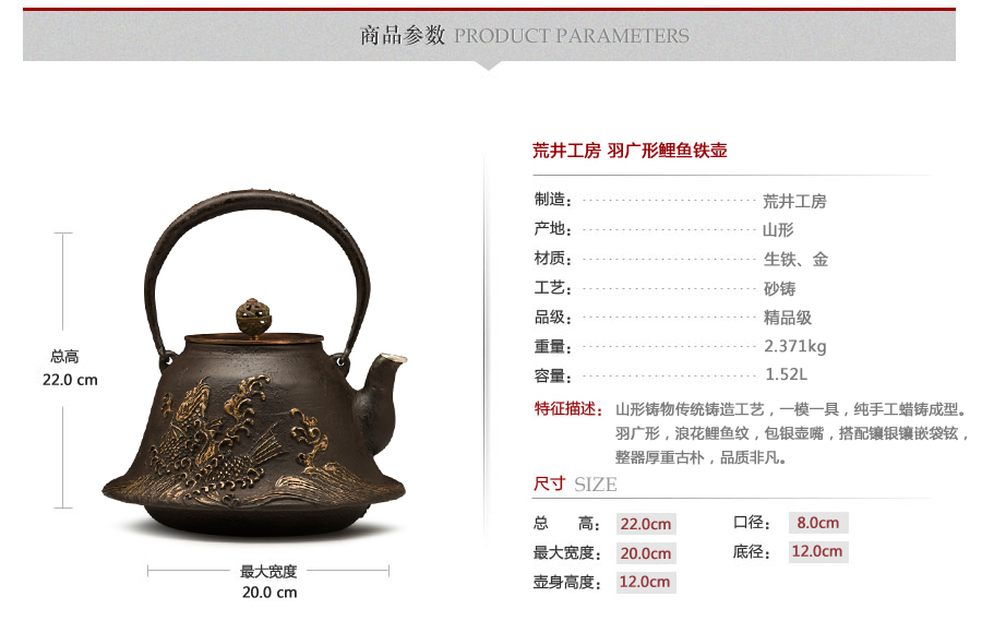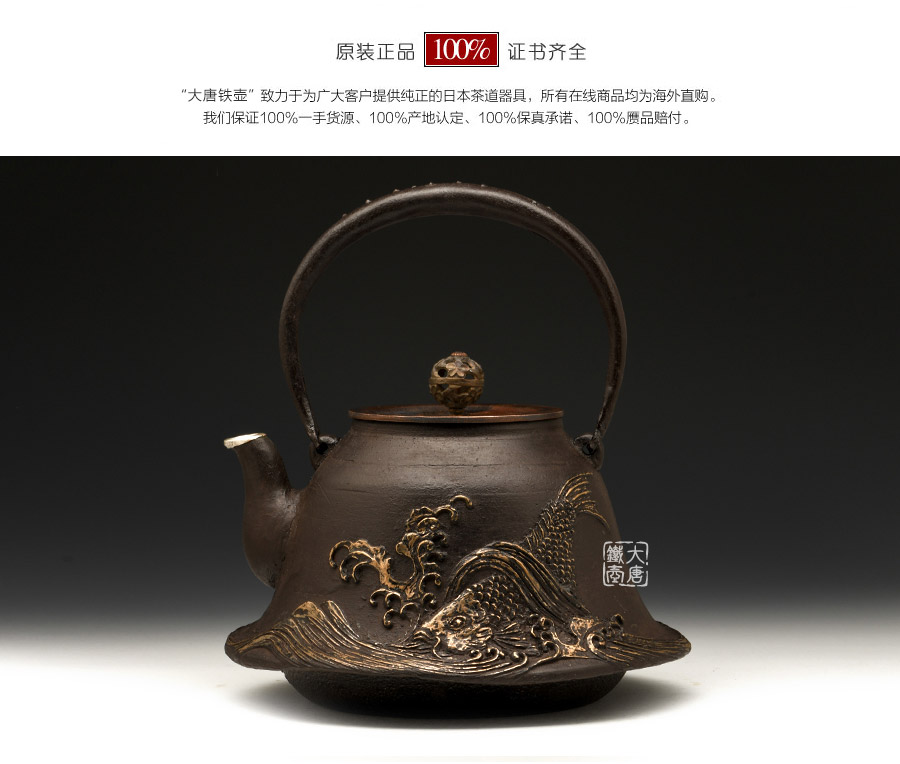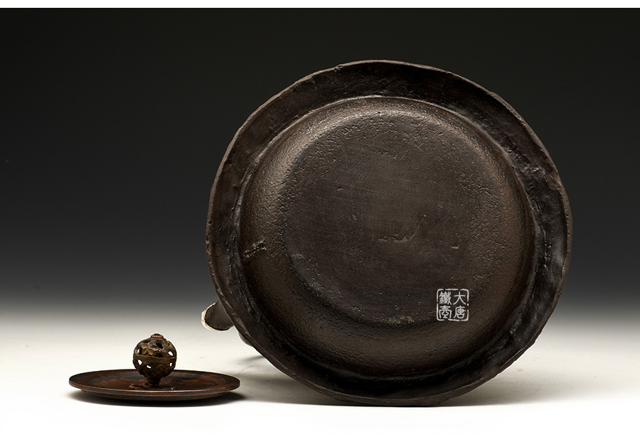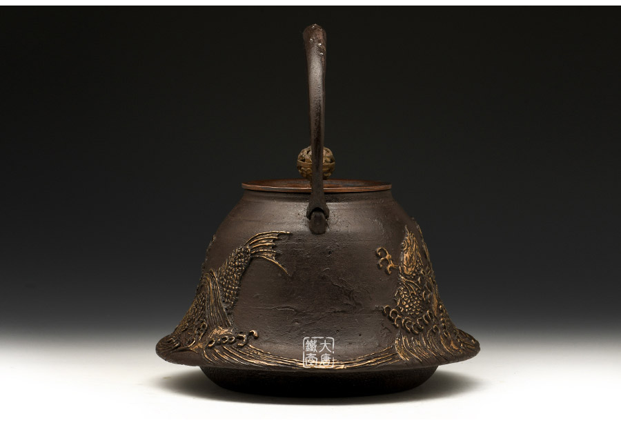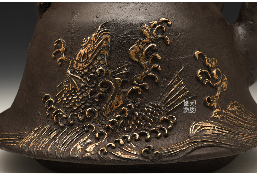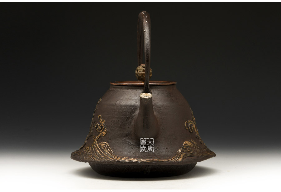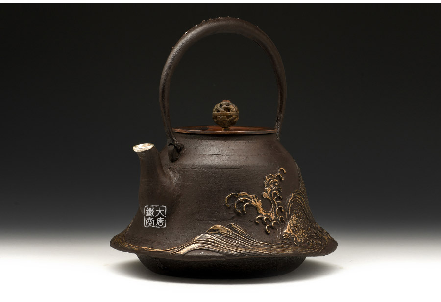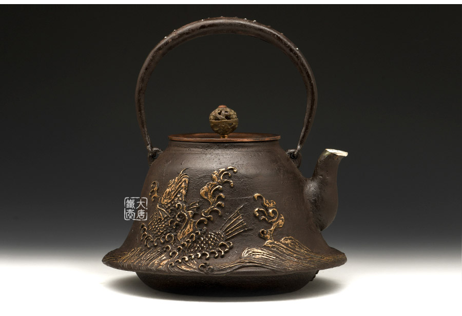 山形鑄物傳統(tǒng)鑄造工藝,一模一具,純手工蠟鑄成型。羽廣形,浪花鯉魚紋,包銀壺嘴,搭配鑲銀鑲嵌袋鉉,整器厚重古樸,品質(zhì)非凡。