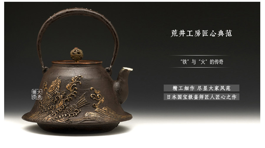 為了追求更為精致的紋理和細(xì)節(jié),當(dāng)代堂主荒井干雄孜孜不倦的將全部精力投入鐵瓶的創(chuàng)作之中,每一作品都經(jīng)由精心醞釀,純手工精心制作,不僅將荒井一家的祖?zhèn)骷妓嚢l(fā)揚(yáng)光大,同時也在鐵瓶界闖出了自己的名聲,成為當(dāng)代的釜師名家。
