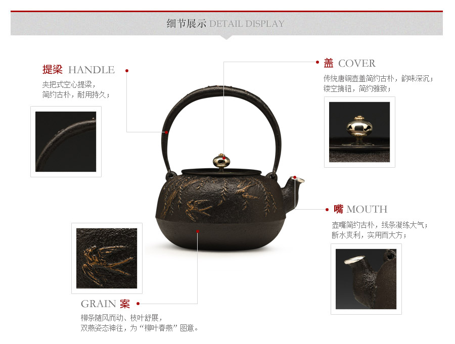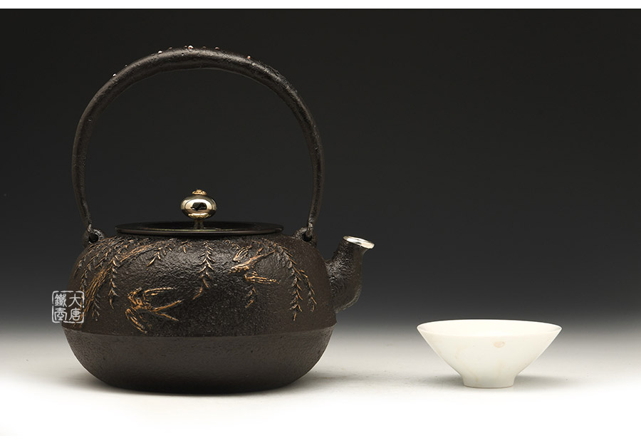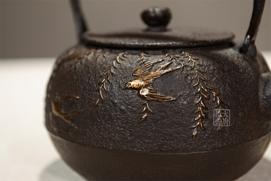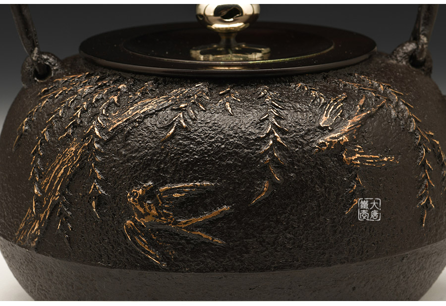 山形鑄物傳統(tǒng)鑄造工藝,一模一具,純手工蠟鑄成型。柳條隨風而動、枝葉舒展,雙燕姿態(tài)神往,為“柳葉春燕”圖意。寥寥數(shù)筆看似隨意,然以有形之柳、燕表現(xiàn)無形之風,可謂功力深厚、匠心獨具。
