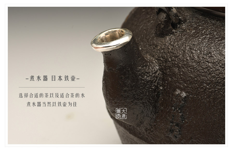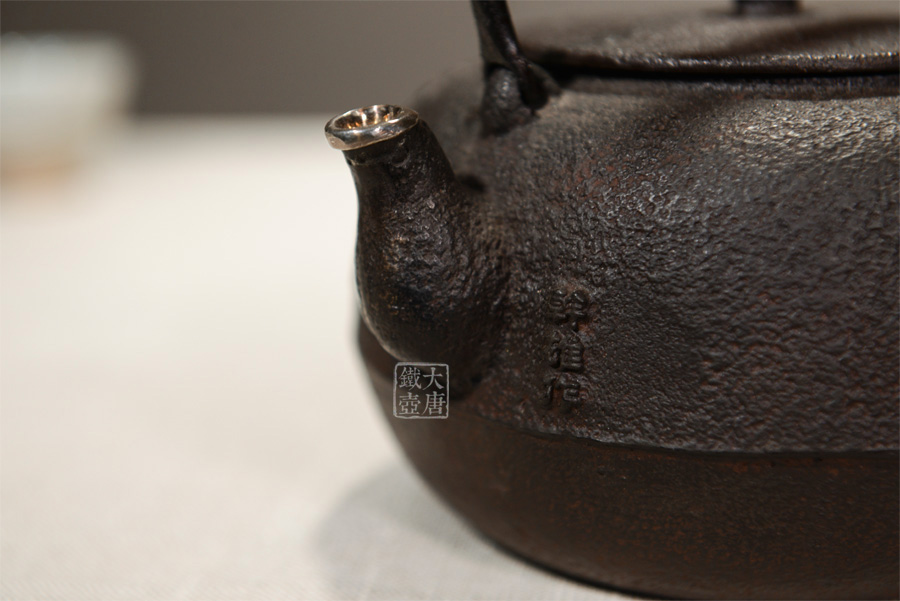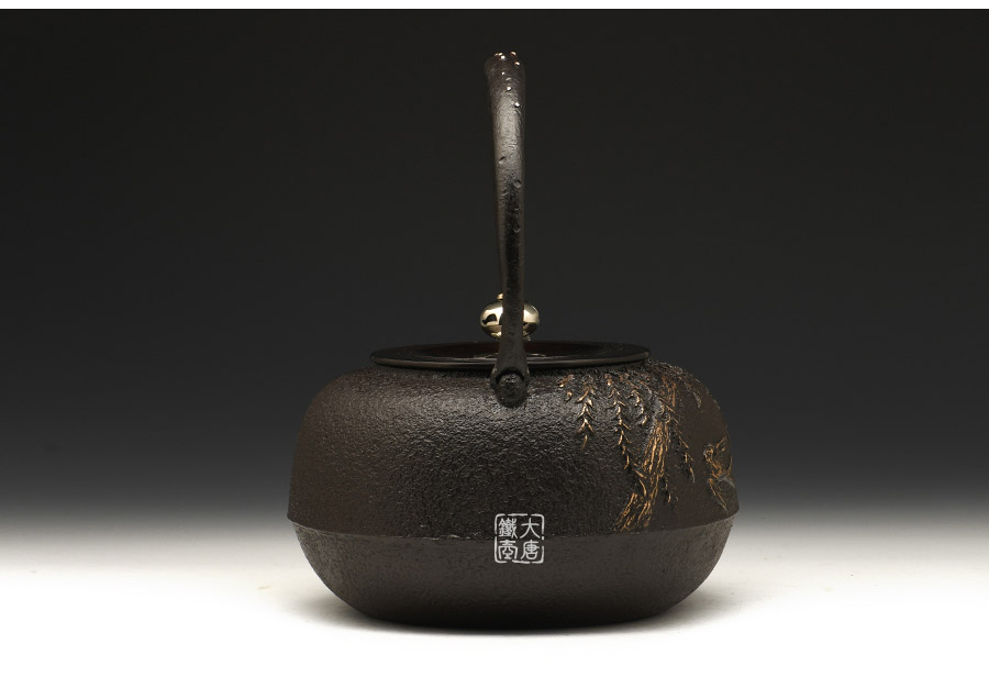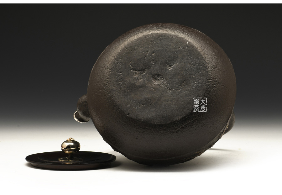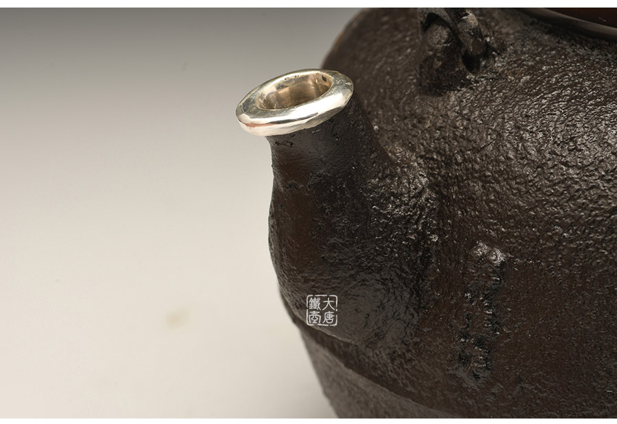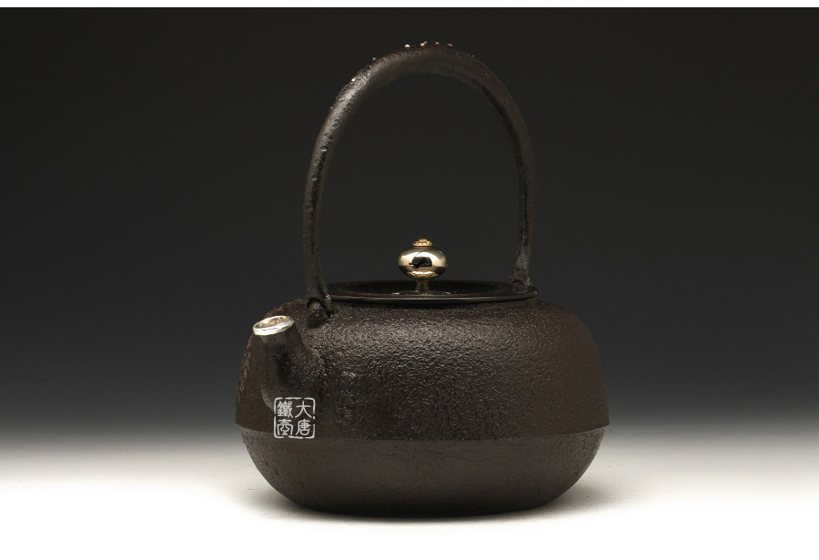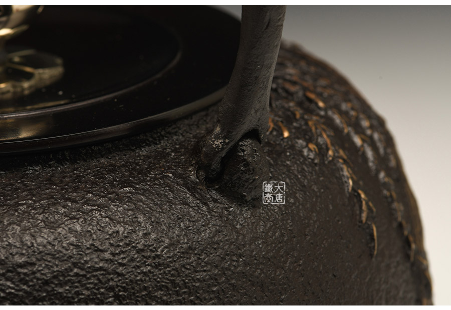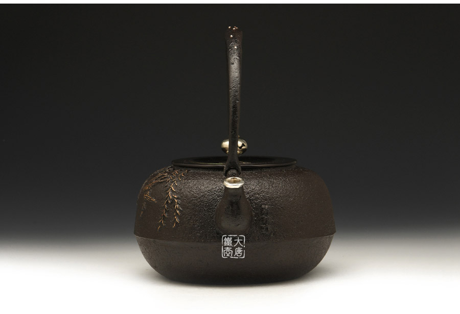 荒井工房的鐵瓶除了在鑄造工藝上有嚴格的規(guī)范和體系,在鐵瓶裝飾技術(shù)上也頗有建樹。除了傳統(tǒng)的印刻技術(shù)外,荒井工房還掌握了非常出色的金銀鑲嵌技藝,尤其以大片的鏨刻銀片最為出眾,這在山形當?shù)靥每谥歇殬湟粠谩?/p>
