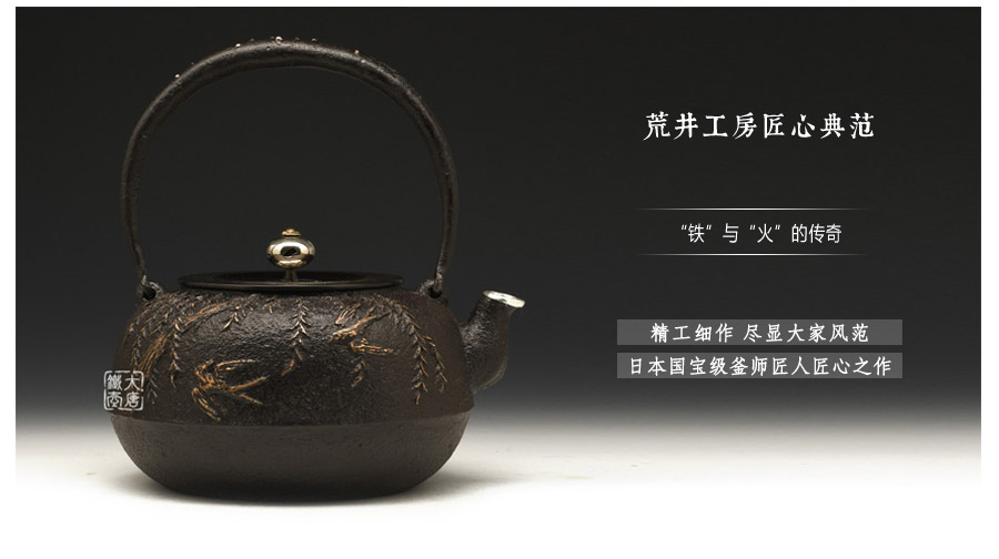 為了追求更為精致的紋理和細節(jié),當代堂主荒井干雄孜孜不倦的將全部精力投入鐵瓶的創(chuàng)作之中,每一作品都經(jīng)由精心醞釀,純手工精心制作,不僅將荒井一家的祖?zhèn)骷妓嚢l(fā)揚光大,同時也在鐵瓶界闖出了自己的名聲,成為當代的釜師名家。