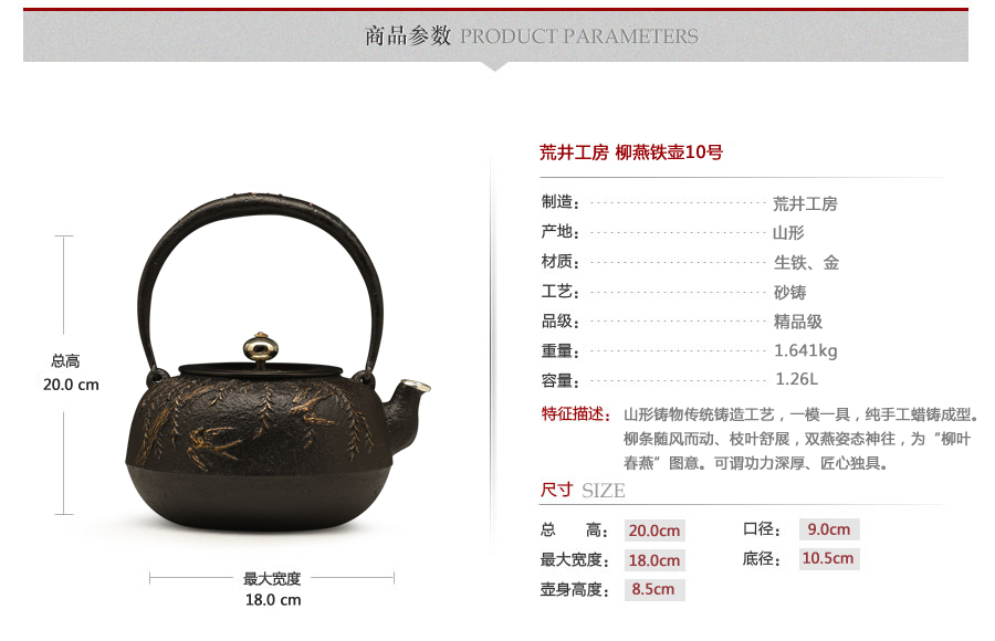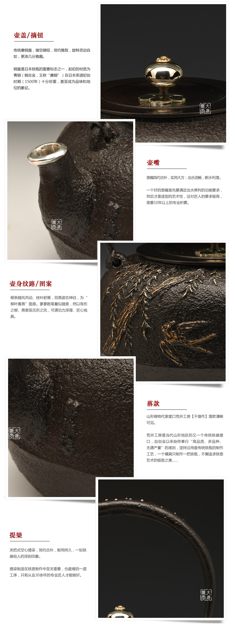 荒井工房是當代山形地區(qū)的又一個傳統(tǒng)鐵器堂口,自創(chuàng)業(yè)以來始終奉行“高品質(zhì)、多品種、無謂產(chǎn)量”的準則,堅持沿用最傳統(tǒng)鐵瓶的制作工藝,一個模具只制作一把鐵瓶,不懈追求鐵壺藝術(shù)的極致之美……