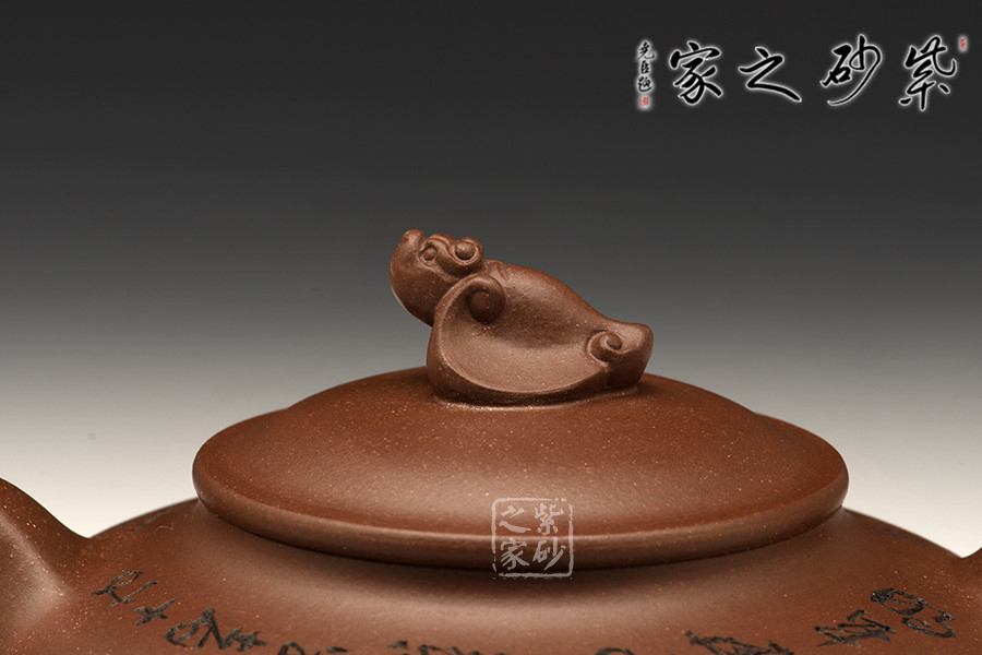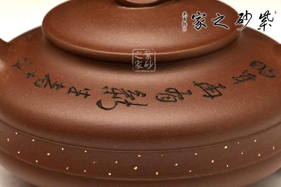“福在眼前”,此壺以蝙蝠寓意“福”,壺腹的一層鋪砂,卻又隱隱有“平沙落雁”的意境。所以觀此壺,不僅僅“福在眼前”,更有“雁落平沙”的古意。